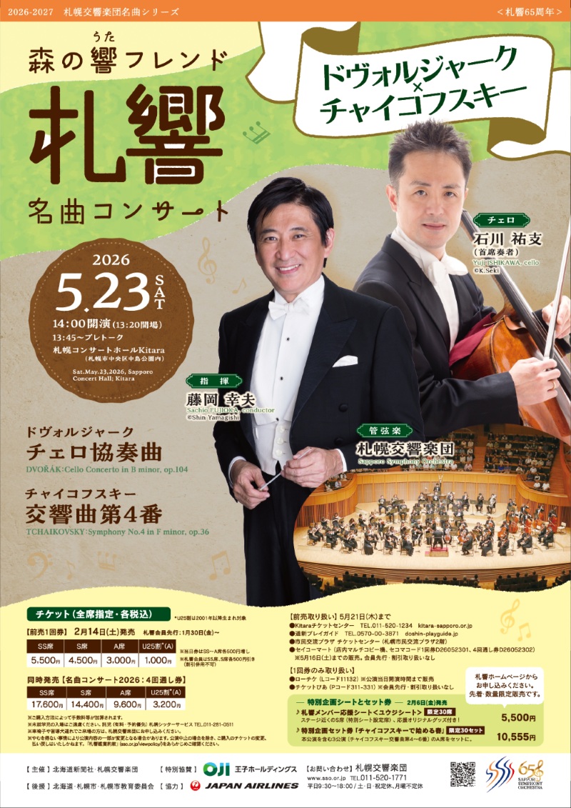 ■Kitaraで開催の演奏会シリーズ14:00開演です。13:45~プレトークもお楽しみください。 ■札響メンバー応援「ユウジシート」対象公演(申込開始2026年2月6日~) ■「”チャイコフスキーで始める春”セット」対象公演(申込開始2026年2月6日~) 『2026-2027 名曲コンサート4回通し券』2月14日(土)発売開始!!(会員先行1/30)