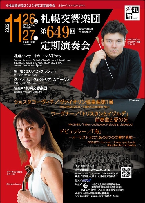 エリアス・グランディ(指揮)、 ヴィクトリア・ムローヴァ(ヴァイオリン)で、ショスタコーヴィチ/ヴァイオリン協奏曲第1番、ワーグナー/「トリスタンとイゾルデ」前奏曲と愛の死、ドビュッシー/「海」を演奏いたします。