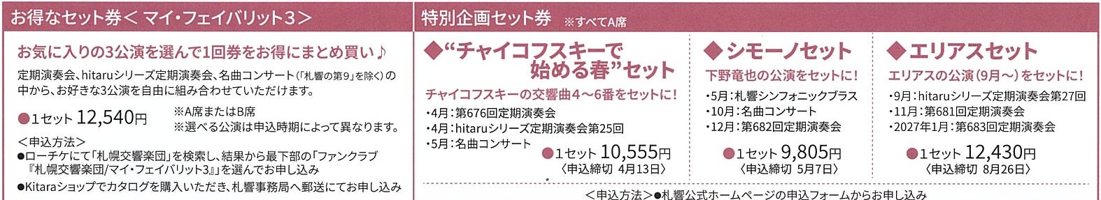 札響定期演奏会・hitaruシリーズ定期演奏会・名曲コンサート(第9公演は除く)の中からお好みの3公演を選んでお得にまとめ買いができます。