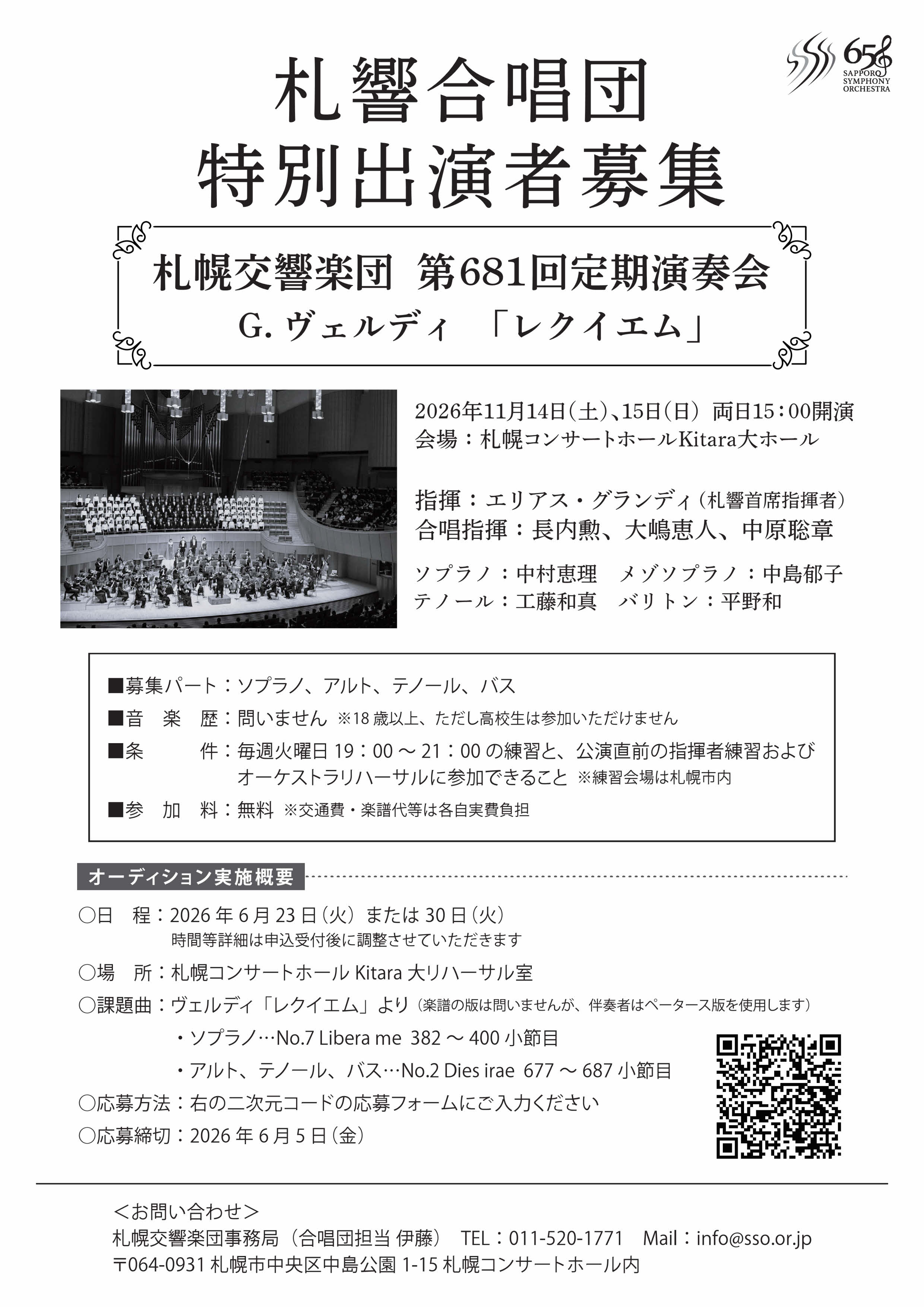 「札響合唱団」ヴェルディ/レクイエム特別出演者オーディションの実施について