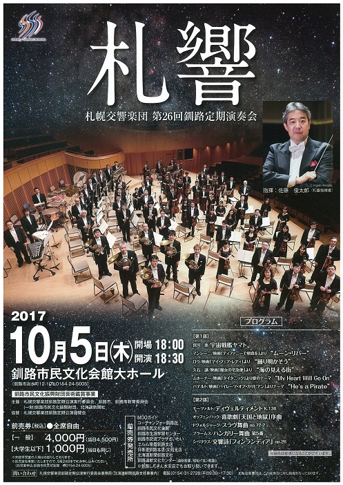 札幌交響楽団釧路定期公演実行委員会 釧路市、釧路市教育委員会、(一財)釧路市民文化振興財団、北海道新聞社 |