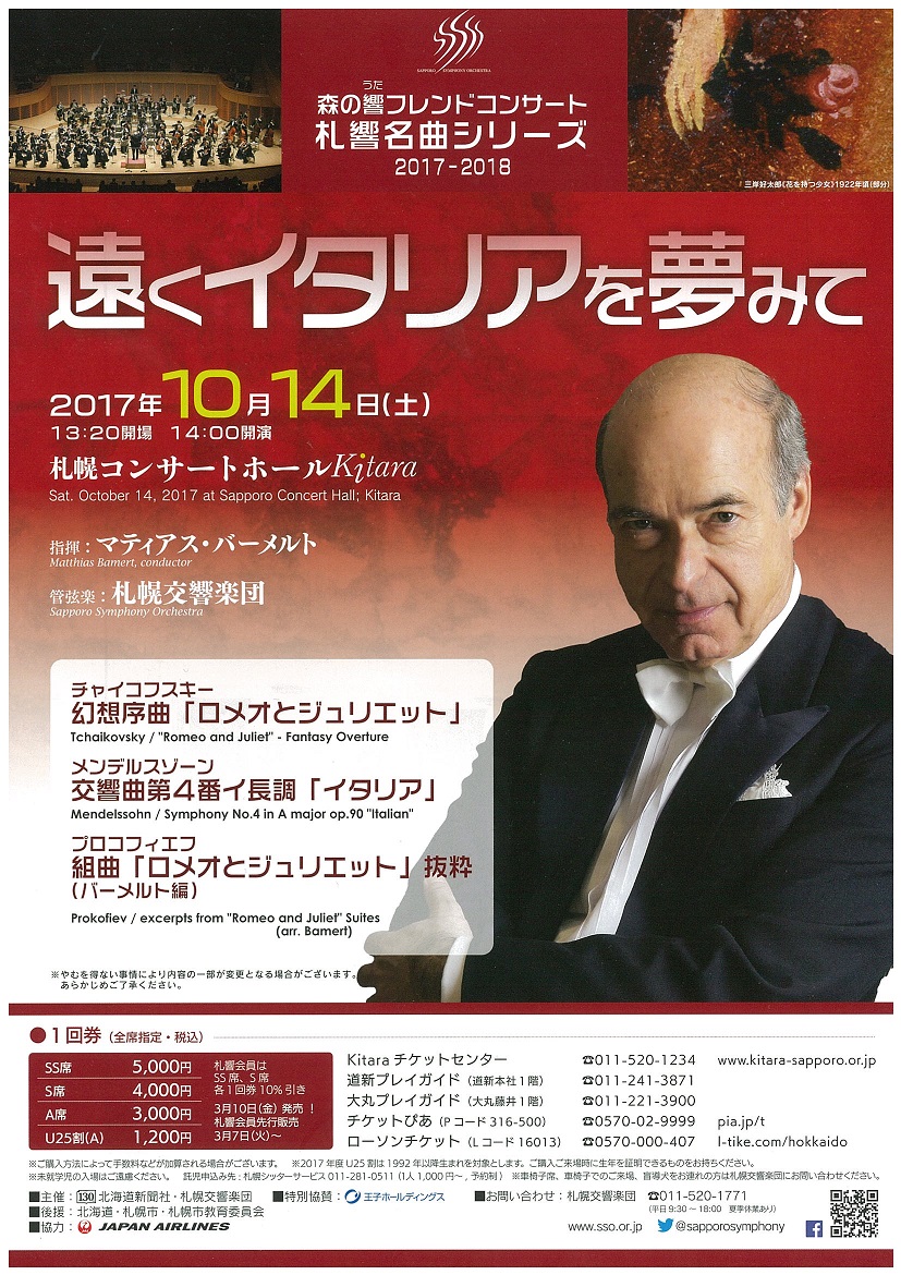森の響フレンドコンサート/札響名曲シリーズ「遠くイタリアを夢みて」 2017年10月14日(土)14:00~ 札幌コンサートホールKitara