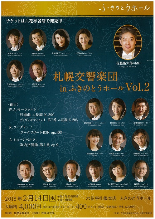 2017年4月に開催しご好評いただいた、ふきのとうホールでの演奏会です。小編成オーケストラの緊密な響きをお楽しみください。