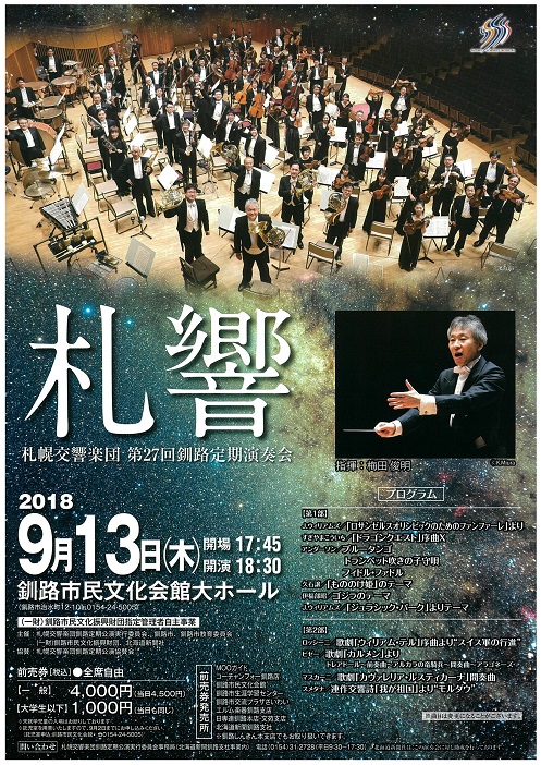 札幌交響楽団釧路定期公演実行委員会 釧路市、釧路市教育委員会、(一財)釧路市民文化振興財団、北海道新聞社 |
