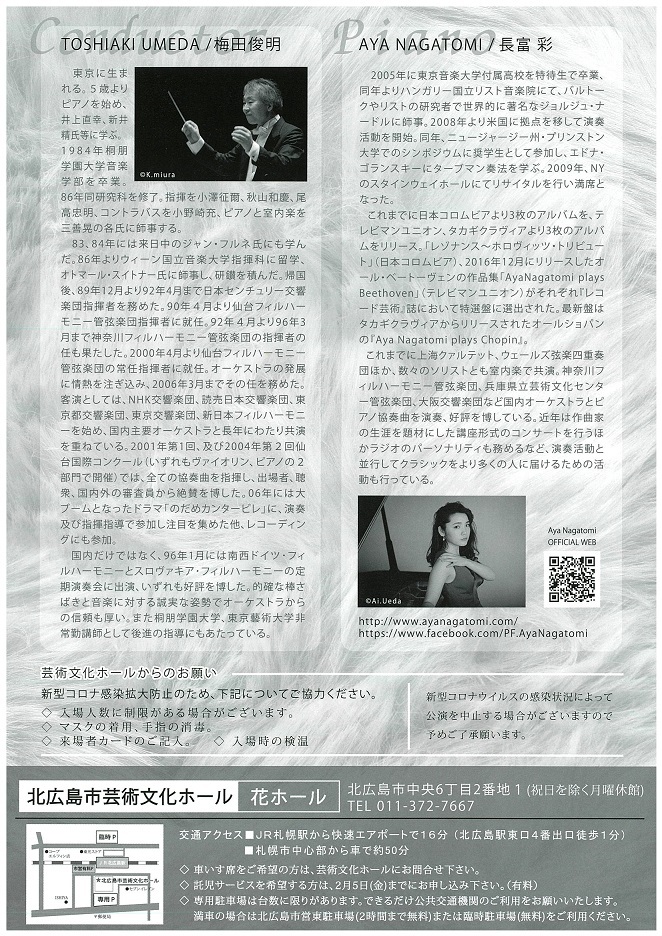 北広島市芸術文化ホールの公演にお越しいただくお客様におかれましては、新型コロナウイルス感染防止の取り組みにご理解とご協力をお願い申し上げます。 ≪芸術文化ホールの感染防止のお願いについて≫ 詳しくは主催公演における新型コロナウイルス感染防止についてのお願いをご覧ください。 ※演奏会詳細:北広島市芸術文化ホール