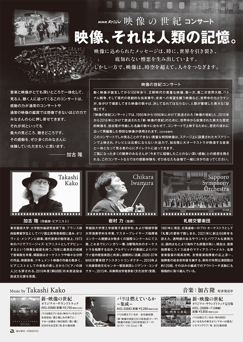動く映像が誕生してから100年余り。王朝時代の貴重な映像、第一次、第二次世界大戦、ベトナム戦争、そして現代の悲劇的な出来事や、未来への希望を願う映像など、世界中のカメラマンが、命がけで撮影してきた映像の数々は、決して忘れてはならない、人類が蓄積した莫大な「記憶」です。 「映像の世紀コンサート」では、1995年から1996年にかけて放送された「映像の世紀」と、2015年から2016年にかけて放送された「新・映像の世紀」のために、世界中から収集された莫大な歴史的映像を、加古隆が作曲した名曲の数々に合わせて、コンサートで上映するために、歴史の流れに沿って再編集した特別な映像が使用されます。このコンサートでしか見ることのできない貴重な特別映像は、ステージ上に設置された大スクリーンで上映され、テレビとは比較にならない大迫力で、加古隆と大オーケストラが熱演する音楽と一体となって見る者の心にダイレクトに迫ってきます。 ご覧になった多くの聴衆のみなさんが『今までに経験したことのない深い感動』との感想を残される、このコンサートならではの感動体験を、ぜひあなたも会場で一緒に分かち合ってください。 ※2016年制作作品:使用する映像の中には遺体が映っているものもありますが、歴史の実態を記録した映像のためそのまま使用いたします。あらかじめご了承ください。