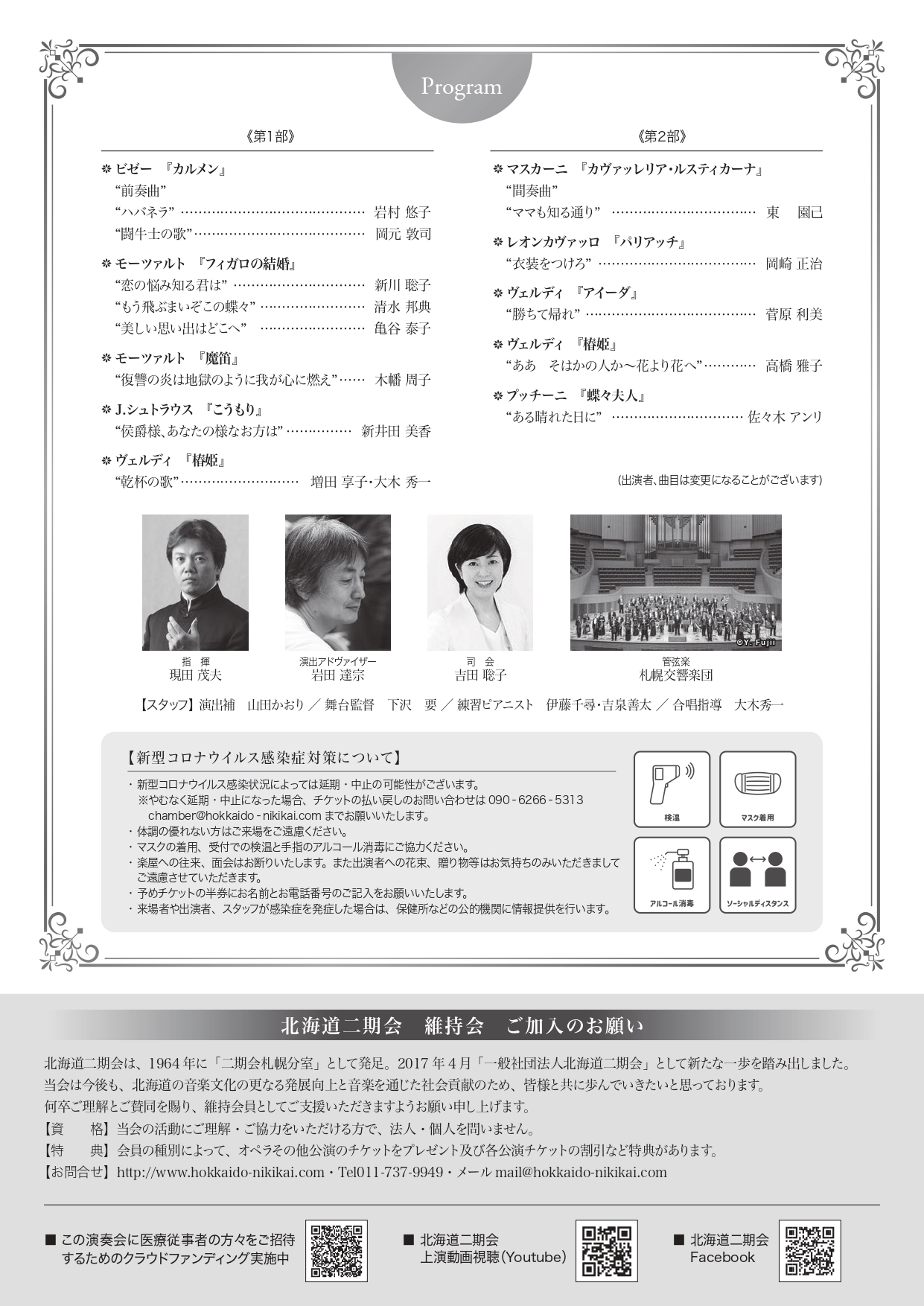 | 主催 | (一社)北海道二期会 共催:札幌市教育文化会館(札幌市芸術文化財団) 後援:札幌市、札幌市教育委員会、北海道日伊協会、札幌音楽家協議会、NPO法人北海道国際音楽交流協会(ハイメス)、北海道新聞社 |