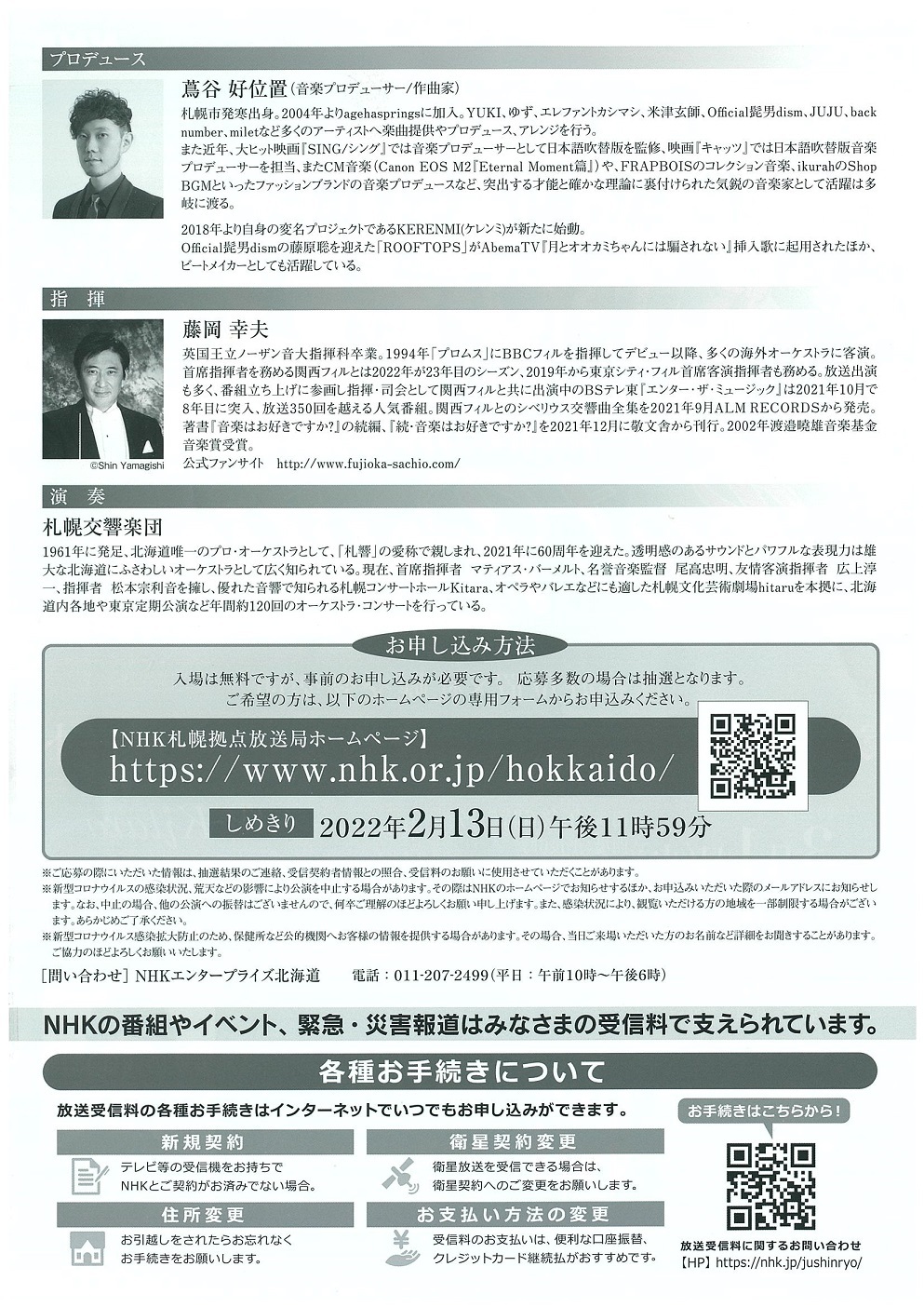 | 主催 | NHK札幌拠点放送局、札幌交響楽団 後援:札幌市、札幌市教育委員会 |