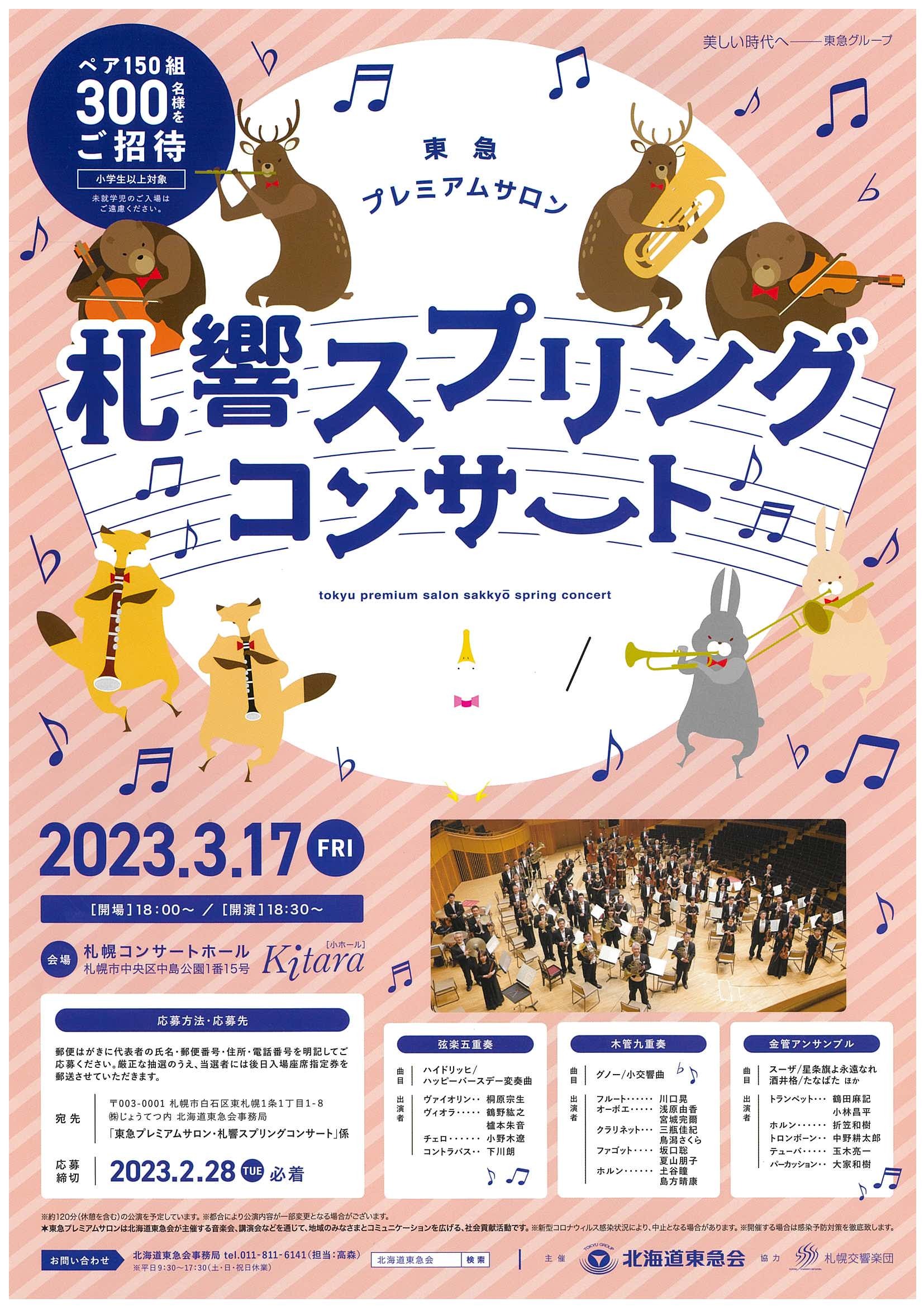 東急プレミアムサロンは北海道東急会が主催する音楽会などを通じて、地域のみなさまとコミュニケーションを広げる、社会貢献活動です。 この「札響スプリングコンサート」では、札響メンバーによるアンサンブルの演奏で、木管、金管、弦楽、それぞれの響きの違いをお楽しみください。