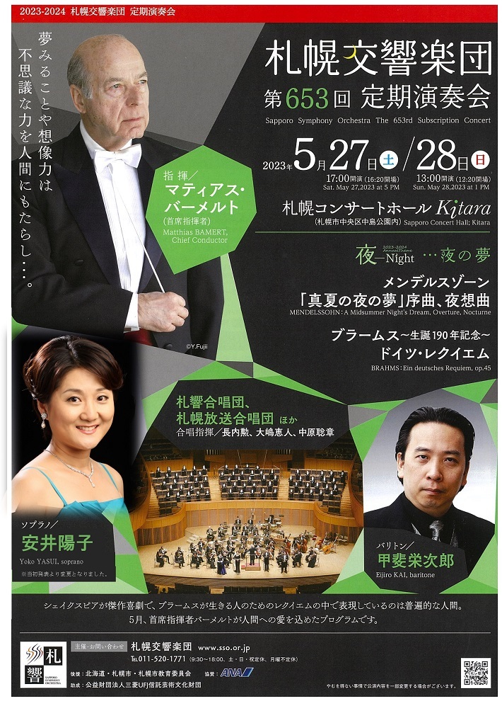 5月27・28日開催『第653回定期演奏会』に出演を予定しておりました、ソプラノ吉田珠代が、本人の事情により出演することが出来なくなりました。代わって、昨年10月定期演奏会「戦時のミサ」(バーメルト指揮)で共演しました安井陽子が出演いたします。なお、曲目、共演者等の変更はございません。何卒ご了承くださいますようお願い申し上げます 開演前「ロビーコンサート」を再開します! 札幌交響楽団へのご支援ご声援に感謝の気持ちをこめて、楽団員たちがロビーコンサートで定期演奏会にご来場の皆様をお迎えいたします。KItaraのホワイエ1階にて、各開演の30分前から10分程度、様々な編成のアンサンブル演奏をお楽しみください。出演、曲目は公演前日に公式ホームページでご案内します。(ロビーコンサート鑑賞の際は、通路の確保など係のご案内にご協力ください)