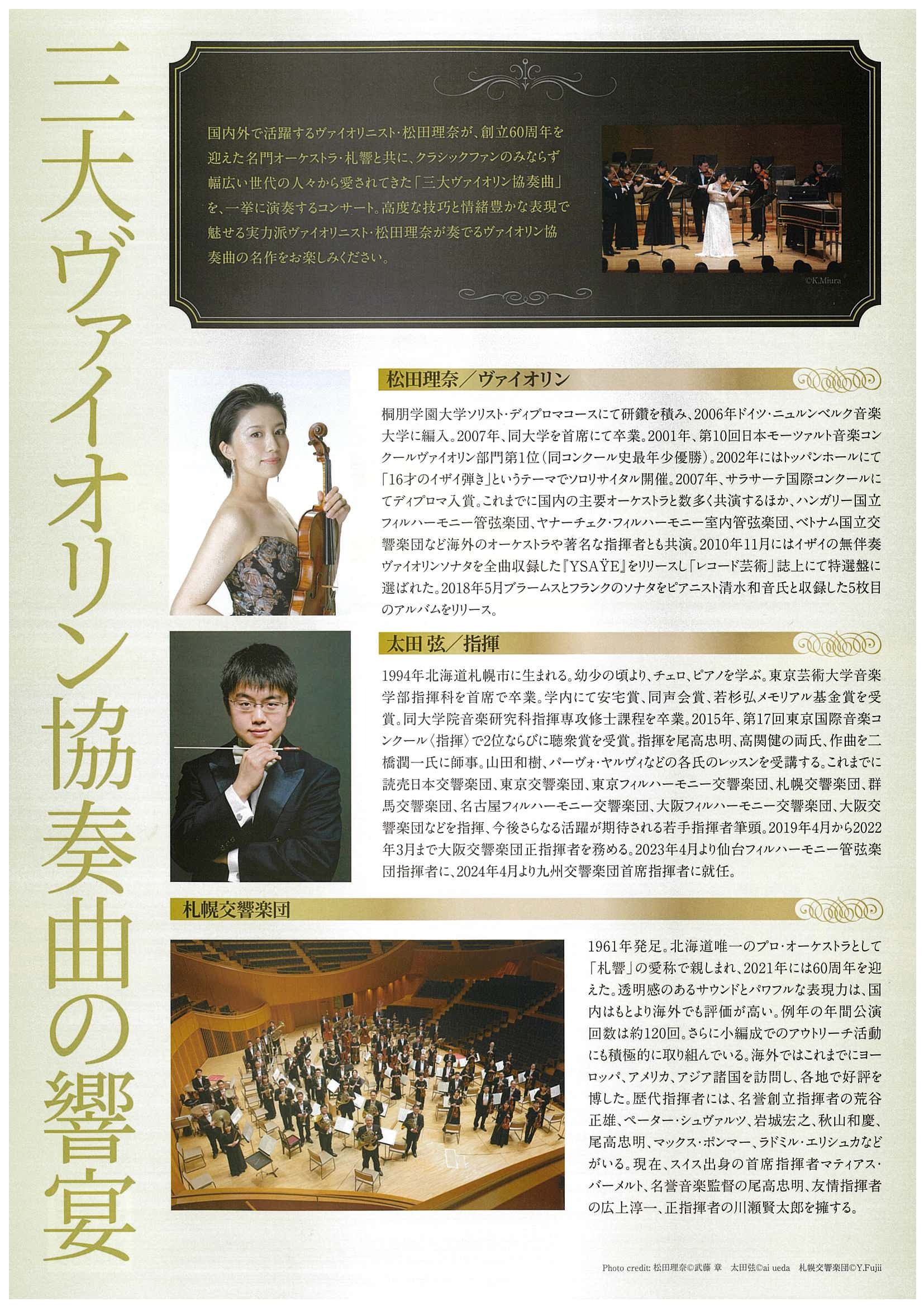 幅広い世代の人たちから愛されてきたヴァイオリン協奏曲の名曲を、高度な技巧と情緒豊かな 表現で聴衆を魅了するヴァイオリニスト松田理奈と札幌交響楽団の共演でお贈りする豪華なコンサート。指揮は、札幌出身の太田 弦、2024年4月より九州交響楽団首席指揮者就任が決まり、今後さらなる活躍が期待される若手筆頭指揮者です。 ※ヴィヴァルディ『四季』は、松田理奈の弾き振り、太田弦指揮はメンデルスゾーン、チャイコフスキーの2曲となります。