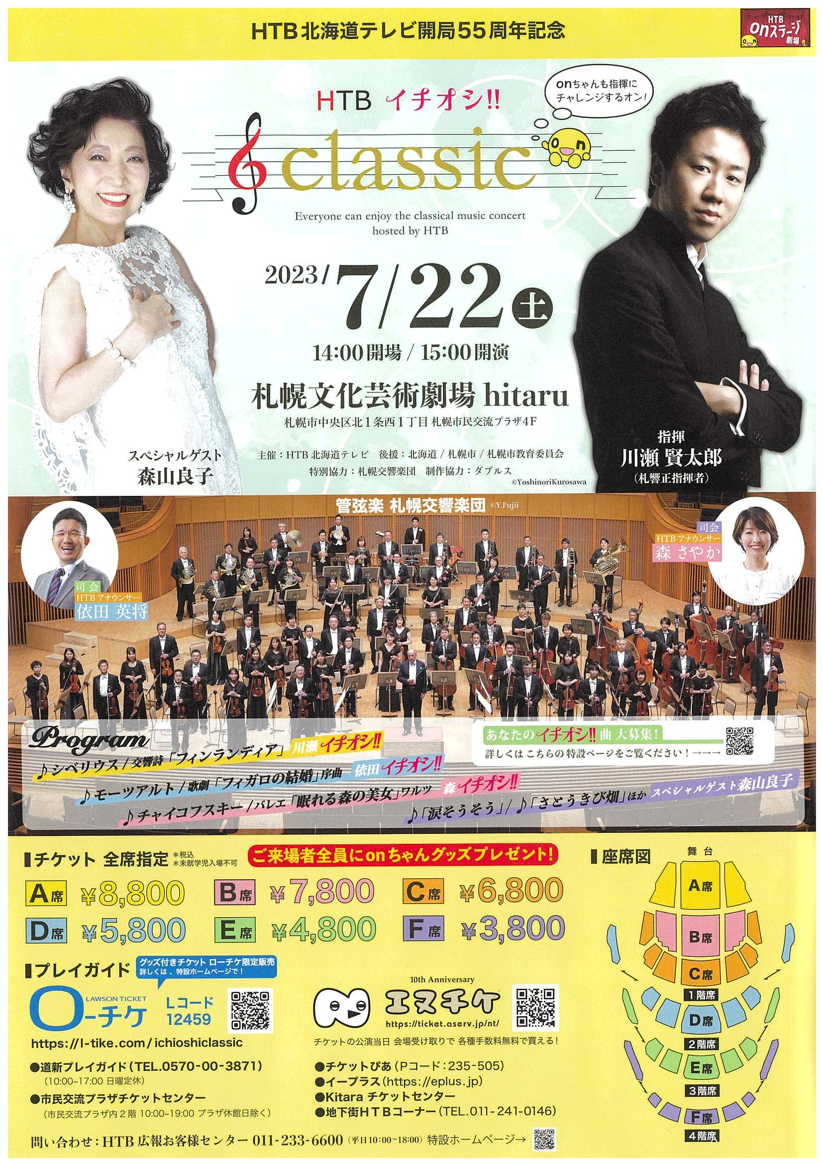 HTBの夕方情報番組であるイチオシ!!と、素敵な音楽の「イチオシ」をお届けするという気持ちを込め、札幌交響楽団とスペシャルゲストである森山良子さんの素敵な演奏を披露いただきます。指揮者は、22年より札幌交響楽団の正指揮者となった川瀬賢太郎さん。司会としてHTBのイチオシ!!番組MCである森さやか・依田英将アナウンサーが会場を盛り上げます。onちゃんが指揮に挑戦するコーナーも。「誰もが楽しめる、分かりやすいクラシックコンサート」を目指して開催いたします。ぜひ豪華メンバーによる「HTB イチオシ!!classic」をお楽しみください。