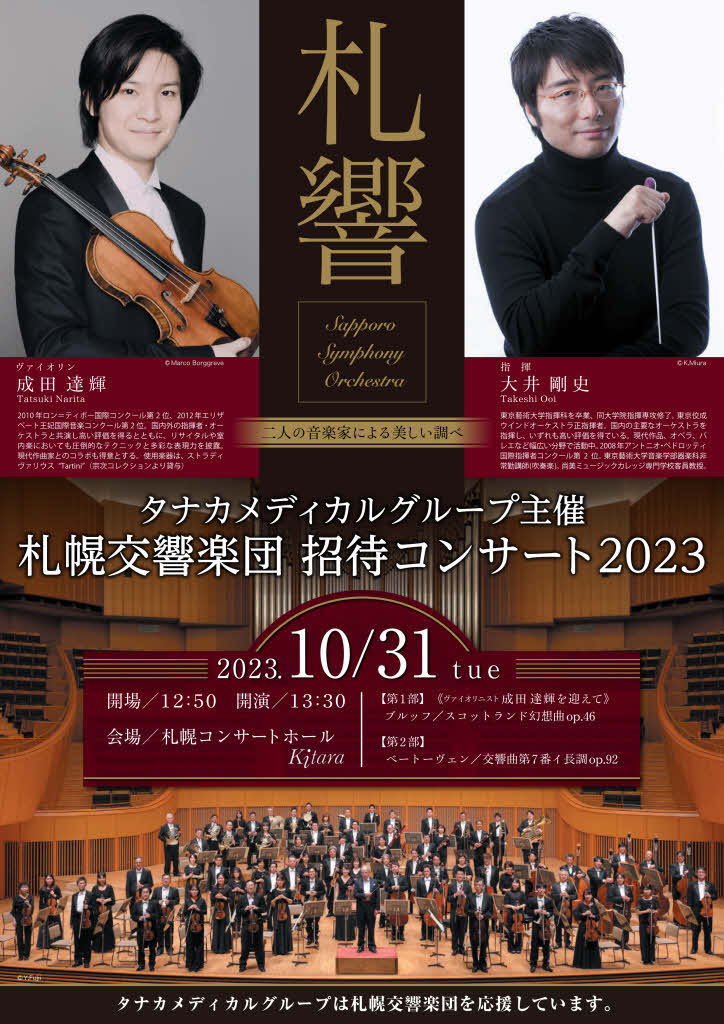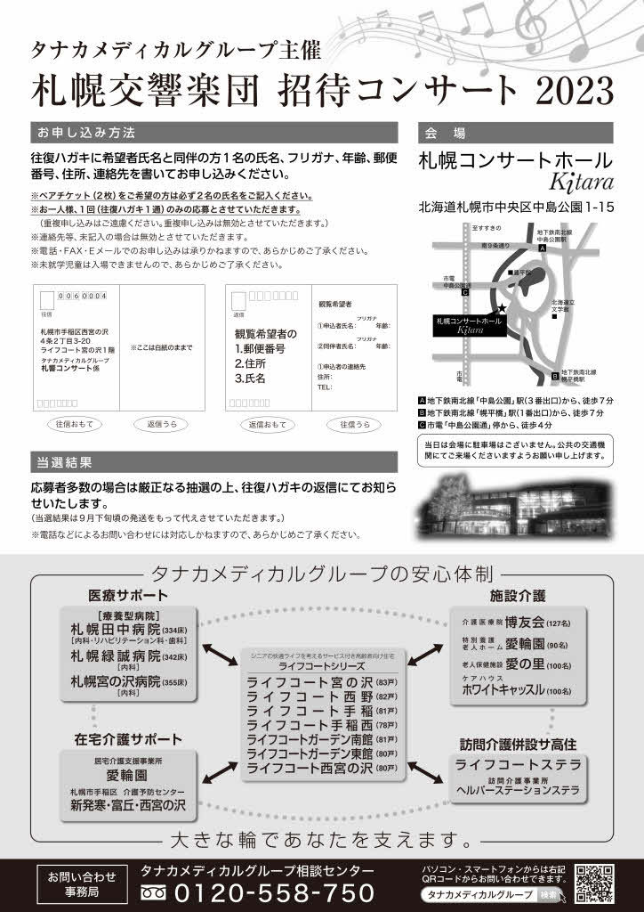 【お申込み方法】 往復ハガキに希望者の氏名と同伴の方1名の氏名、フリガナ、年齢、郵便番号、住所、連絡先を書いてお申し込みください。お申込み詳細は下記ホームページでご確認ください。 ●タナカメディカルグループホームページ:https://www.tanakamedical.net/common/img/pdf/sakkyo_concert2023.pdf ※ペアチケット(2枚)をご希望の方は必ず2名の氏名をご記入ください。 ※お一人様、1回(往復ハガキ1通)のみの応募とさせていただきます。(重複申込無効) ※連絡先等、未記入の場合は無効とさせていただきます。 ※電話・FAX・Eメールでのお申し込みは承りかねますので、あらかじめご了承ください。 ※未就学児童は入場できませんので、あらかじめご了承ください。 【当選結果】 ※応募者多数の場合は厳正なる抽選の上、往復ハガキの返信にてお知らせいたします。※当選結果は9月下旬ころの発送をもって代えさせていただきます。 ※電話などによるお問い合わせには対応いたしかねますので、あらかじめご了承ください。
