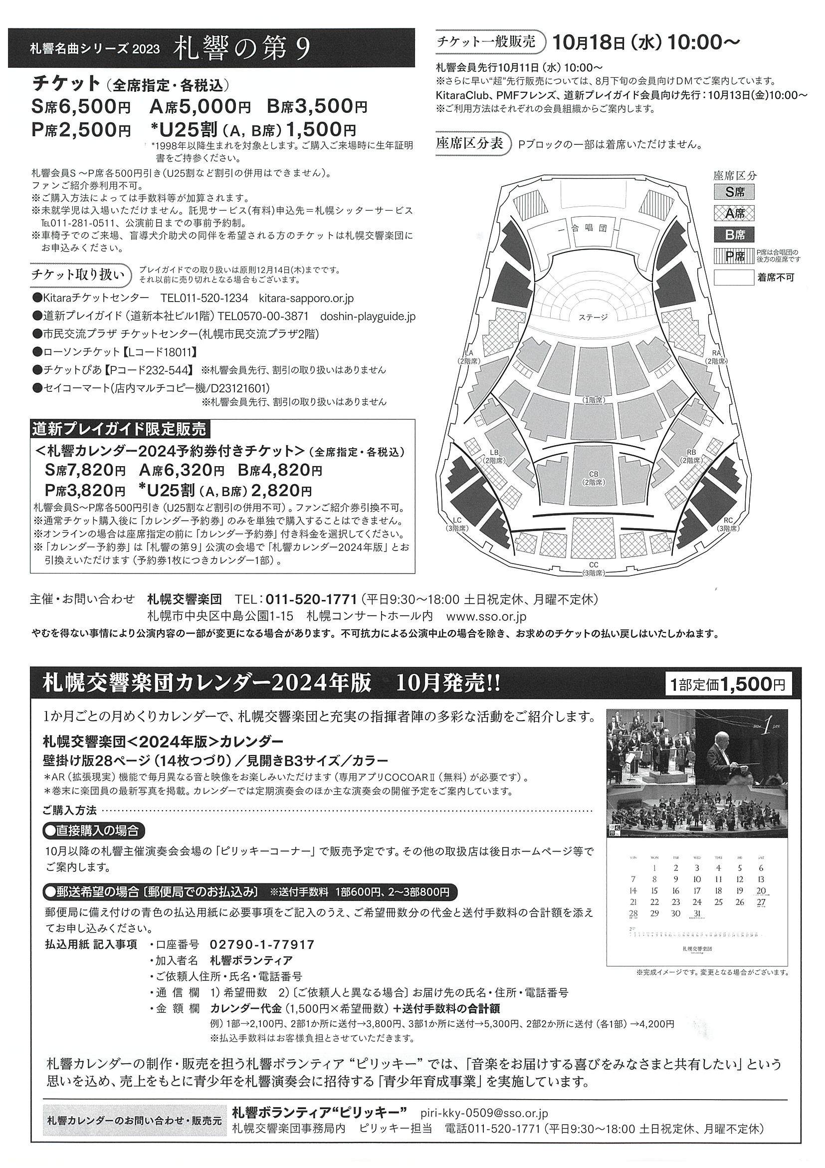 S席7,820円、A席6,320円、B席4,820円、P席3,820円(売切) 、U25割(A・B席)2,820円 札響会員S~P席各500円引き(U25割など割引併用不可) ※「札響の第9」のチケットをご購入の際、座席指定の前に「カレンダー予約券」付き料金を選択してください。通常チケット購入後に「カレンダー予約券」のみを単独で購入することはできません。 ※「カレンダー予約券」は「札響の第9」公演の会場で「札響カレンダー2024年版」とお引換えいただけます(予約券1枚につきカレンダー1冊)。