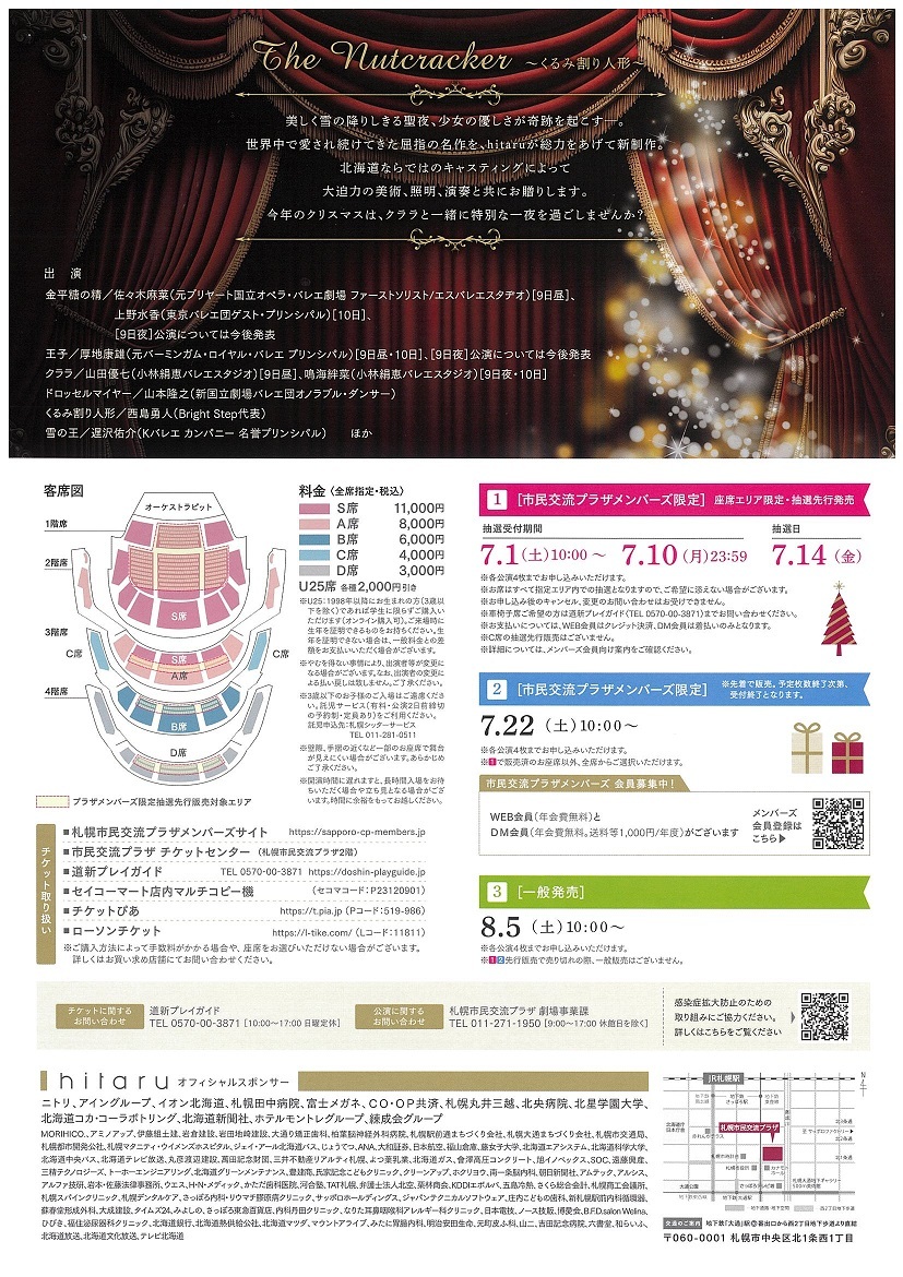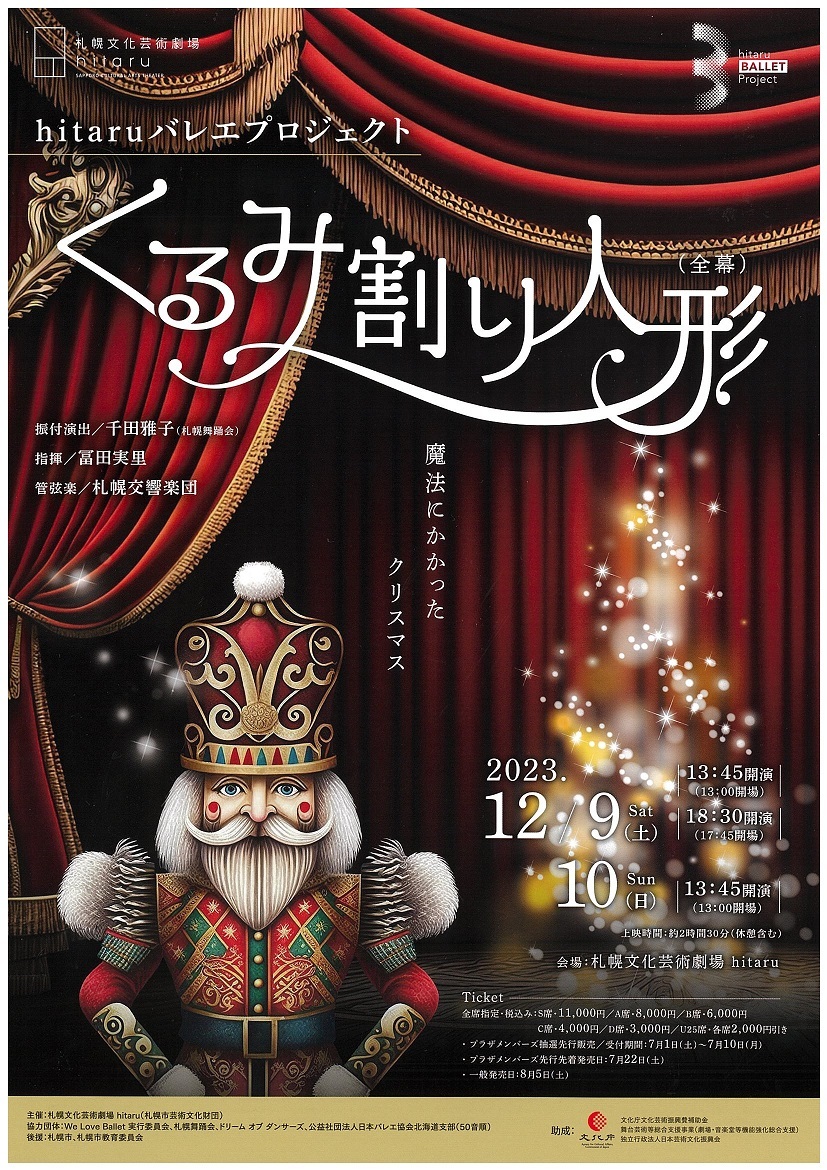 札幌文化芸術劇場 hitaruが、地元のバレエ団体、実演芸術家などの協力を得て、hitaruを舞台とした新たなバレエ作品を創造・発信する「hitaru バレエプロジェクト」。その記念すべき第1回公演として、この冬「くるみ割り人形」を全幕上演します。オーディションで選ばれた北海道の約90名のダンサーにゲストダンサーを迎え、大迫力の美術、照明、演奏とともにお贈りする、特別なクリスマスの物語をお楽しみください。 『魔法にかかったクリスマス』 美しく雪の降りしきる聖夜、少女の優しさが奇跡を起こす—。チャイコフスキー三大バレエ作品の中でも、子どもの夢と魔法に満ちたファンタジーを描き出す「くるみ割り人形」。世界中で愛され続けてきた屈指の名作を、hitaruが総力をあげて新制作します。今年のクリスマスは、クララと一緒に特別な一夜を過ごしませんか?(主催者ホームページより引用) 公演時間 約2時間30分(休憩含む) 【キャスト詳細は下記URLよりご確認ください】 ●札幌市民交流プラザホームページ:https://www.sapporo-community-plaza.jp/event.php?num=3149