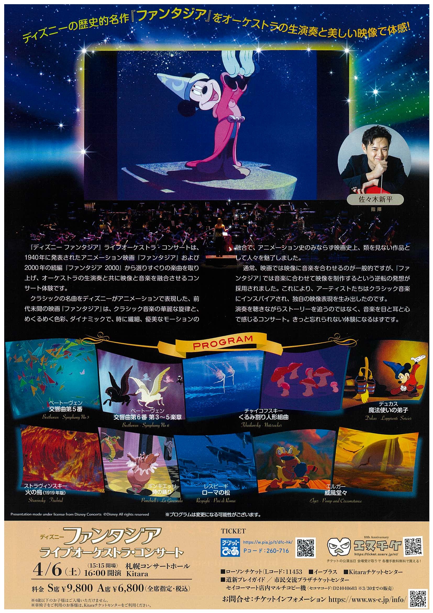 『ディズニー ファンタジア』ライブオーケストラ・コンサートは、1940年に発表されたアニメーション映画『ファンタジア』および2000年の続編『ファンタジア2000』から選りすぐりの楽曲を取り上げ、オーケストラの生演奏と共に映像と音楽を融合させるコンサート体験です。クラシックの名曲をディズニーがアニメーションで表現した、前代未聞の映画『ファンタジア』は、クラシック⾳楽の華麗な旋律と、めくるめく⾊彩、ダイナミックで、時に繊細、優美なモーションの融合で、アニメーション史のみならず映画史上、類を⾒ない作品として⼈々を魅了しました。通常、映画では映像に音楽を合わせるのが一般的ですが、『ファンタジア』では音楽に合わせて映像を制作するという逆転の発想が採用されました。これにより、アーティストたちはクラシック音楽にインスパイアされ、独自の映像表現を生み出したのです。演奏を聴きながらストーリーを追うのではなく、音楽を目と耳と心で感じるコンサート。きっと忘れられない体験になるはずです。(ファンタジア2024ホームページより引用) ※ファンタジア2024札幌公演ホームページ:詳細はこちらから