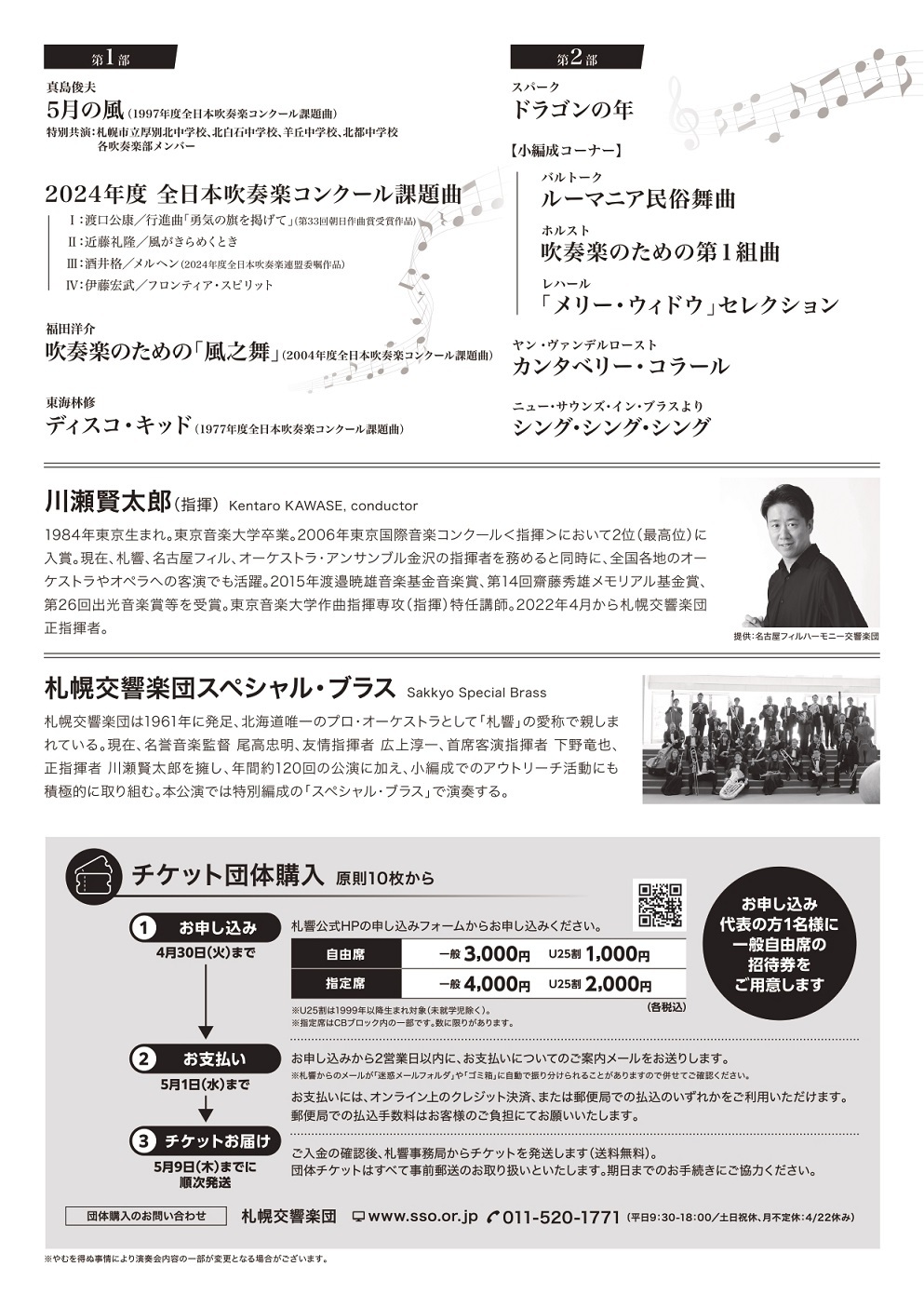 【自由席】3,000円、U25割1,000円* 【指定席**】4,000円、U25割2,000円* *U25割は1999年以降生まれ対象(未就学児入場不可) **指定席はCBブロックの一部、Kitaraチケットセンターでの限定販売です ★10名以上の団体購入は、こちらからお申込みください。(3/6~) ♪販売プレイガイド 指定席・自由席販売:Kitaraチケットセンター 自由席販売:チケットぴあ、ローソンチケット、道新プレイガイド、市民交流プラザチケットセンター、セイコーマート(店内マルチコピー機)、三響楽器 【開場は開演の1時間前からとなります】 ●未就学児入場不可 ●託児申込み(有料、予約制)札幌シッターサービス011-281-0511 ≪公演時における託児サービスについて≫ ※やむをえない事情により公演内容の一部が変更になる場合がございます。公演中止の場合を除き、お求めのチケットの払戻しはいたしかねます。体調や状況の変化に不安のある方はご購入前に十分にご検討ください。 |