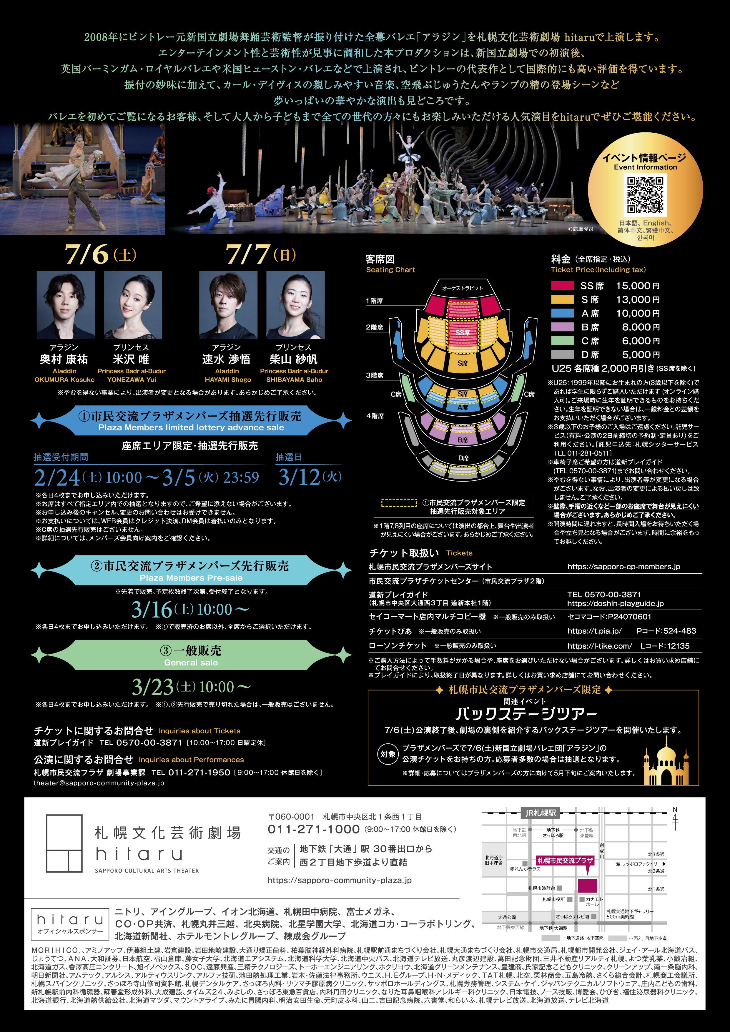 | チケット | (SS)¥15,000 (S)¥13,000 (A)¥10,000 (B)¥8,000 (C)¥6,000 (D)¥5,000 U25 各席種2,000円引き(SS席を除く) ※U25:1999年以降にお生まれの方(3歳以下を除く)であれば学生に限らずご購入いただけます (オンライン購入可)。ご来場時に生年を証明できるものをお持ちください。生年を証明できない場合は、一般料金との差額をお支払いいただく場合がございます。 ♪チケット販売詳細:札幌市民交流プラザホームページをご確認ください。 【チケット発売状況】 ①[プラザメンバーズ限定] 座席エリア限定・抽選先行販売/抽選受付期間2/24(土)10:00~3/5(火)23:59/抽選日3/12(火) ※各日4枚までお申し込みいただけます。 ※お席はすべて指定エリア内での抽選となりますので、ご希望に添えない場合がございます。 ※お申し込み後のキャンセル、変更のお問い合わせはお受けできません。 ※お支払いについては、WEB会員はクレジット決済、DM会員は着払いのみとなります。 ※C席の抽選先行販売はございません。 ※詳細については、メンバーズ会員向け案内をご確認ください。 ②[プラザメンバーズ先行発売]※先着で販売。予定枚数終了次第、受付終了となります。/3/16(土)10:00~ ※各日4枚までご購入いただけます。 ※①で販売済のお席以外、全席からご選択いただけます。 ③[一般発売]3/23(土)10:00~ ※各日4枚までご購入いただけます。 ※①、②先行販売で売り切れた場合は、一般販売はございません。 ≪チケット取扱い≫ ■札幌市民交流プラザメンバーズサイト https://sapporo-cp-members.jp ■市民交流プラザチケットセンター、道新プレイガイド、セイコーマート店内マルチコピー機(セコマコード:P24070601)※一般発売のみ取扱い、チケットぴあ※一般発売のみ取扱い、ローソンチケット※一般発売のみ取扱い ※ご購入方法によって手数料がかかる場合や、座席をお選びいただけない場合がございます。詳しくはお買い求め店舗にてお問合せください。 ※プレイガイドにより、取扱い終了日が異なります。詳しくはお買い求め店舗にてお問い合わせください。 ※3歳以下のお子様のご入場はご遠慮ください。託児サービス(有料・公演の2日前締切の予約制・定員あり)をご利用ください。[託児申込先:札幌シッターサービス TEL 011-281-0511] ※車椅子席ご希望の方は道新プレイガイド(TEL 0570-00-3871)までお問い合わせください。 ※やむを得ない事情により、出演者等が変更になる場合がございます。なお、出演者の変更による払い戻しは致しません。ご了承ください。 ※壁際、手摺の近くなど一部のお座席で舞台が見えにくい場合がございます。あらかじめご了承ください。 ※開演時間に遅れますと、長時間入場をお待ちいただく場合や立ち見となる場合がございます。時間に余裕をもってお越しください。 |