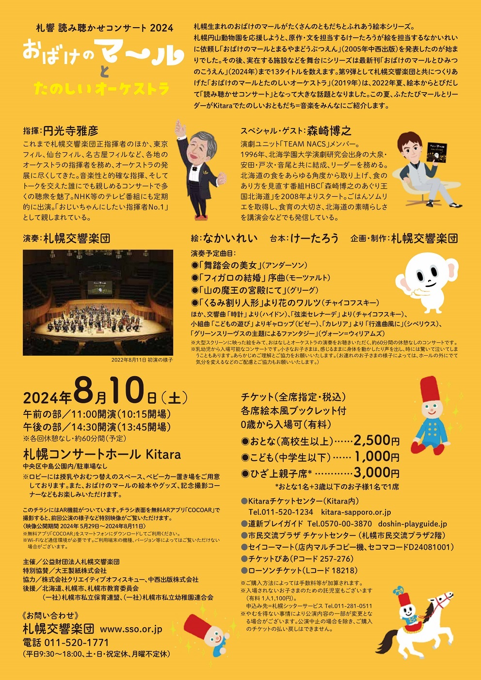 | チケット | 【全席指定】おとな(高校生以上):2,500円、こども(中学生以下):1,000円、ひざ上親子券3,000円(3歳以下の乳幼児とおとなで1席) ※ご入場には必ずチケットが必要です。3歳以下でも座席をご利用される場合は、こども(中学生以下)席をご購入ください。 ※ひざ上親子席はおとな(高校生以上)1名と3歳までのお子さま1名が入場できます。 ※演奏の途中での入場はできません。曲間等で係員がご案内いたします。 ※車椅子でのご来場や盲導犬・介助犬などお連れを希望の方、10枚以上の団体購入の希望は、札響にお問い合わせください。 ※入場されないお子様のための託児室は前日までの予約制です(有料)。申込先=札幌シッターサービス011-281-0511 ≪公演時における託児サービスについて≫ ※ロビーには授乳室、おむつ替えスペース、ベビーカー置き場を用意しています。 ※やむをえない事情により公演内容の一部が変更になる場合がございます。公演中止の場合を除き、お求めのチケットの払戻しはいたしかねます。体調や状況の変化に不安のある方はご購入前に十分にご検討ください。 【プレイガイド】Kitaraチケットセンター、道新プレイガイド、市民交流プラザチケットセンター、セイコーマート(店内マルチコピー機セコマコードD24081001)、チケットぴあ、ローソンチケット |