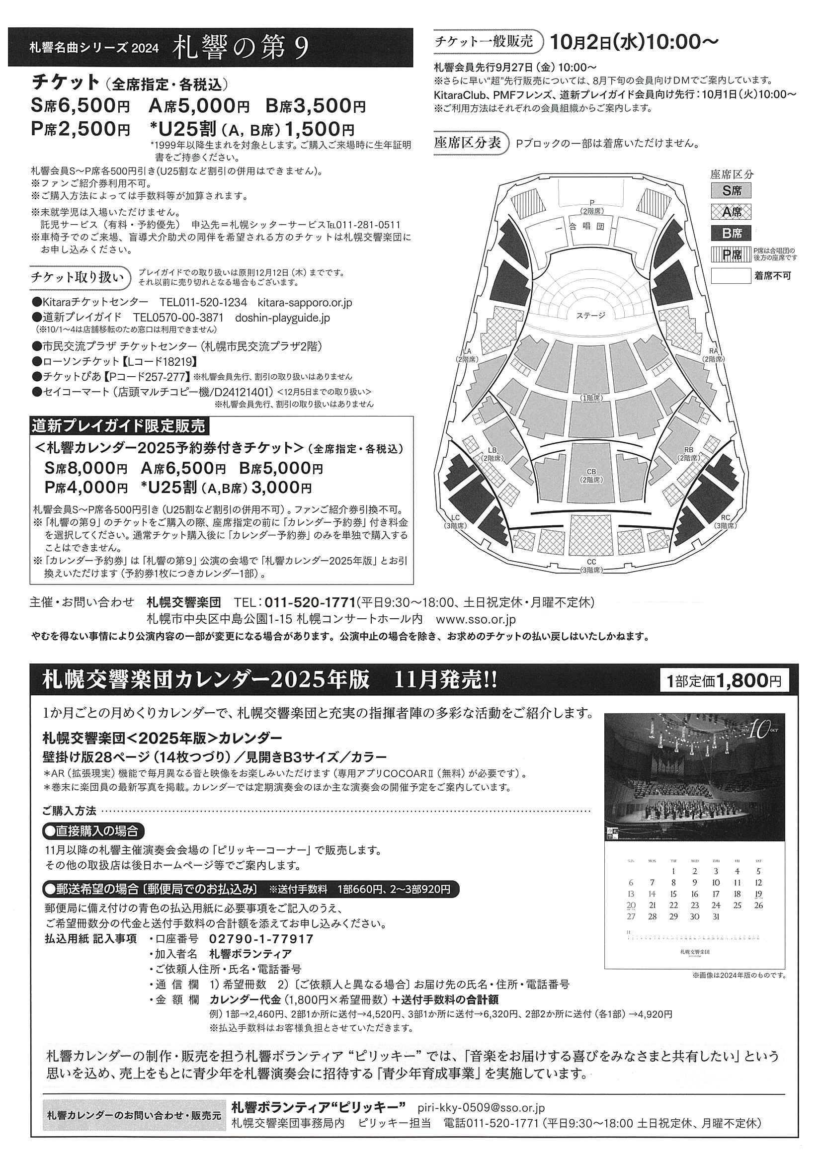 【道新プレイガイド限定販売】~札響カレンダー2025予約券付きチケット S席8,000円、A席6,500円、B席5,000円、P席4,000円、U25割(A・B席)3,000円 札響会員S~P席各500円引き(U25割など割引併用不可)。ファンご紹介券引換不可 ※席種によっては売り切れとなっている場合がございます。 ※「札響の第9」のチケットをご購入の際、座席指定の前に「カレンダー予約券」付き料金を選択してください。通常チケット購入後に「カレンダー予約券」のみを単独で購入することはできません。 ※「カレンダー予約券」は「札響の第9」公演の会場で「札響カレンダー2025年版」とお引換えいただけます(予約券1枚につきカレンダー1冊)。