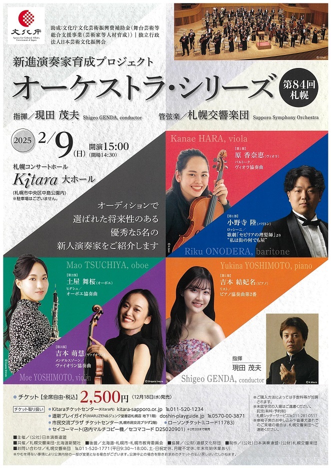 文化庁・次代の文化を創造する新進芸術家育成事業 11月1日に出演者オーディションを実施。選ばれた5名の若手演奏家が札幌交響楽団と協演いたします。