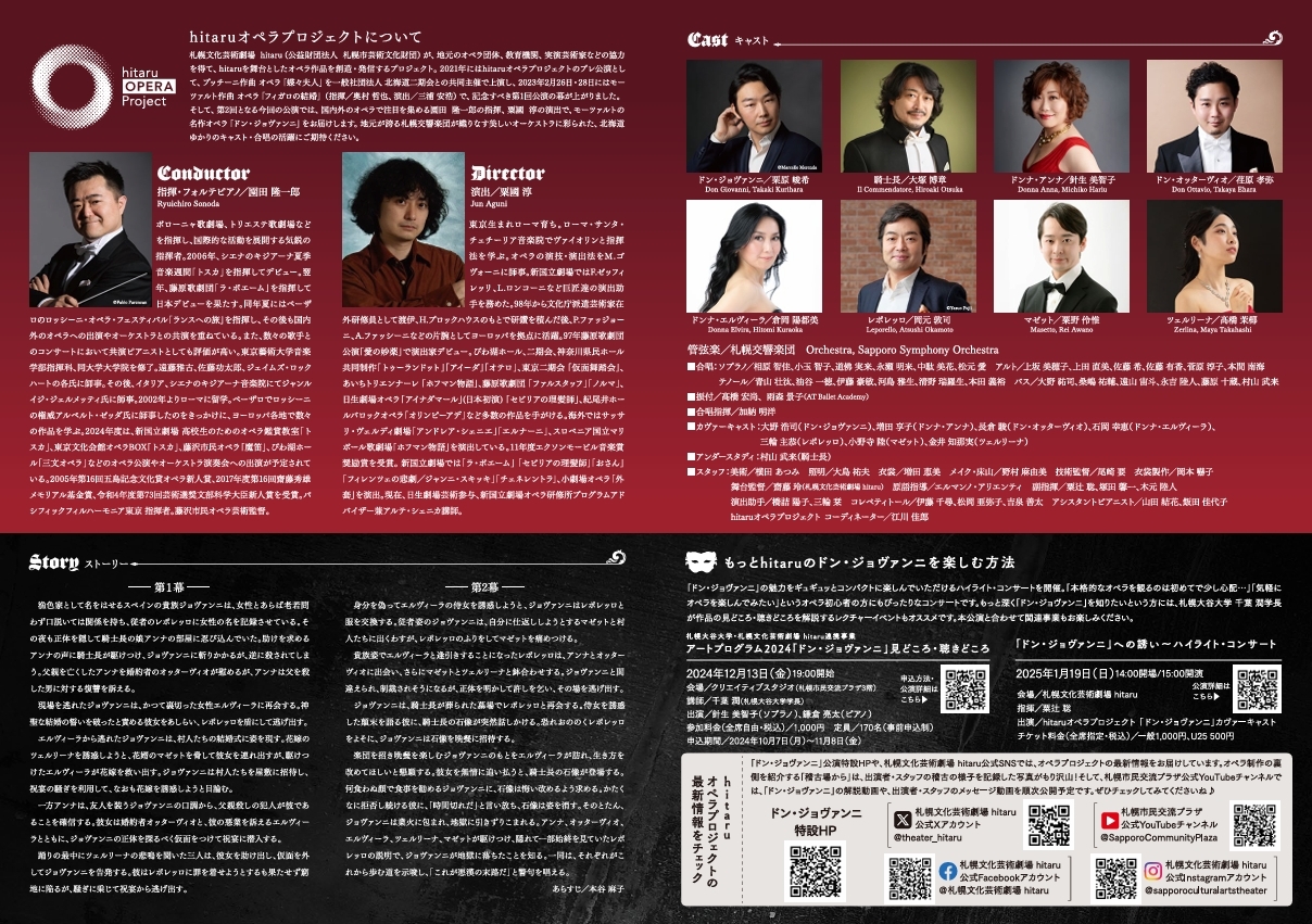 札幌文化芸術劇場hitaru(公益財団法人 札幌市芸術文化財団)が、地元のオペラ団体、教育機関、実演芸術家などの協力を得て、hitaruを舞台としたオペラ作品を創造・発信するプロジェクト。2021年にはhitaruオペラプロジェクトのプレ公演として、プッチーニ作曲 オペラ「蝶々夫人」を一般社団法人 北海道二期会との共同主催で上演し、2023年2月26日・28日にはモーツァルト作曲 オペラ「フィガロの結婚」(指揮/奥村 哲也、演出/三浦 安浩)で、記念すべき第1回公演の幕が上がりました。そして、第2回となる今回の公演では、国内外のオペラで注目を集める園田 隆一郎指揮、粟國 淳演出で、モーツァルトの名作オペラ「ドン・ジョヴァンニ」をお届けします。地元が誇る札幌交響楽団が織りなす美しいオーケストラに彩られた、北海道ゆかりのキャスト・合唱の活躍にご期待ください。(主催者ホームページより引用) 公演時間 約3時間30分(休憩含む) 【キャスト詳細は下記URLよりご確認ください】 ●札幌市民交流プラザホームページ:https://sapporo-community-plaza.jp/event_don-giovanni.html