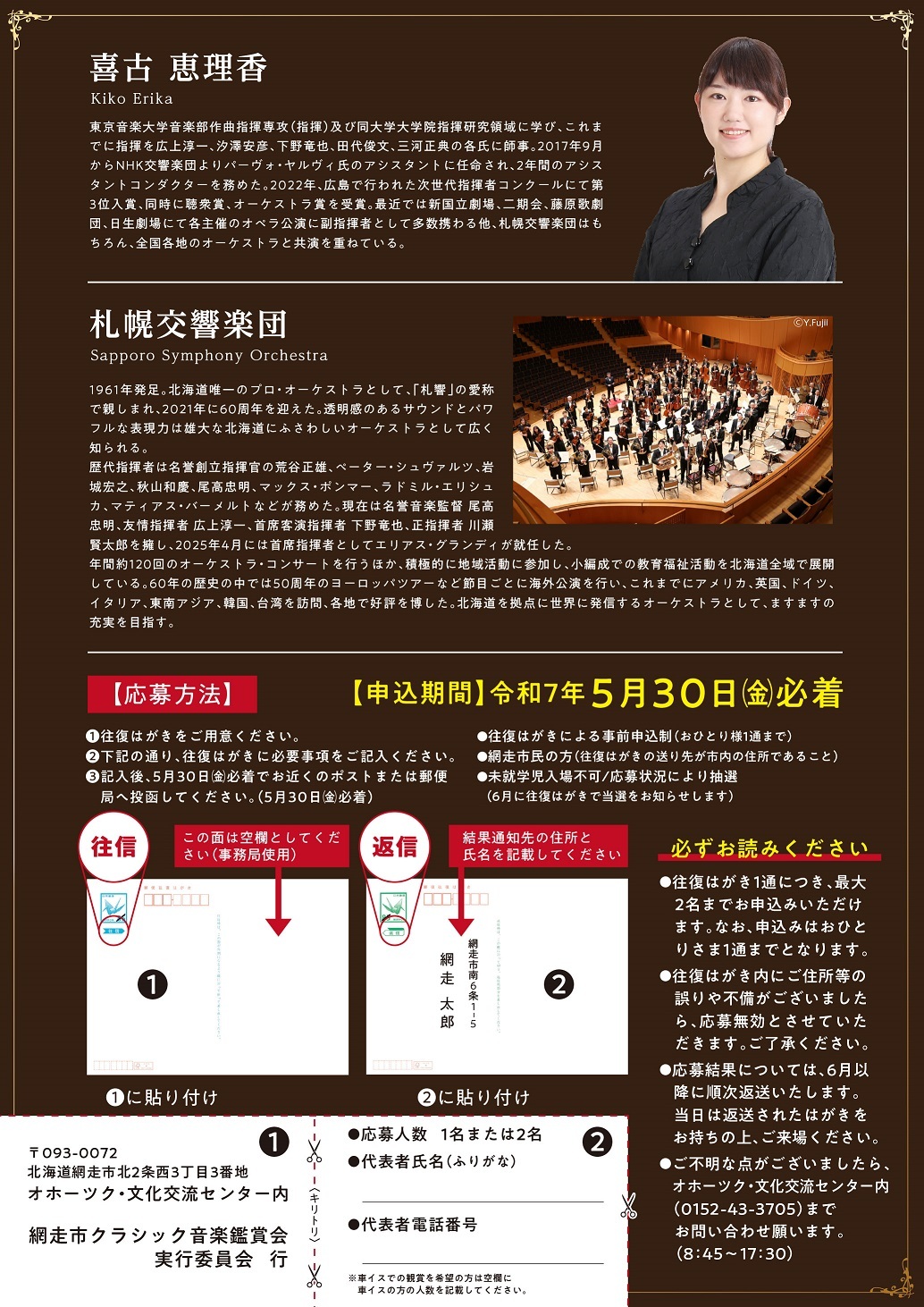●申込方法:往復はがきによる事前申込制(おひとり様1通まで) ●申込条件:網走市民の方(往復はがきの送り先が市内の住所であること) 申込方法詳細は特設ホームページに記載しています。 ●応募多数の場合は抽選といたします。(抽選結果は返信はがきにより6月以降に返送) ●当選はがきは入場券となるため、大切に保管してください。(再発行は不可) ●未就学児不可 ※往復はがきに1通につき、最大2名までお申込みいただけます。なお、申込はおひとりさま1通までとなります。 ※往復はがき内にご住所等の誤りや不備がございましたら、応募無効とさせていただきます。ご了承ください。 ※応募結果については、6月以降に順次返送いたします。当日は返送されたはがきをお持ちの上、ご来場ください。 ※ご不明な点がございましたら、オホーツク・文化交流センター内(0152-43-3705)までお問い合わせ願います(8:45~17:30)