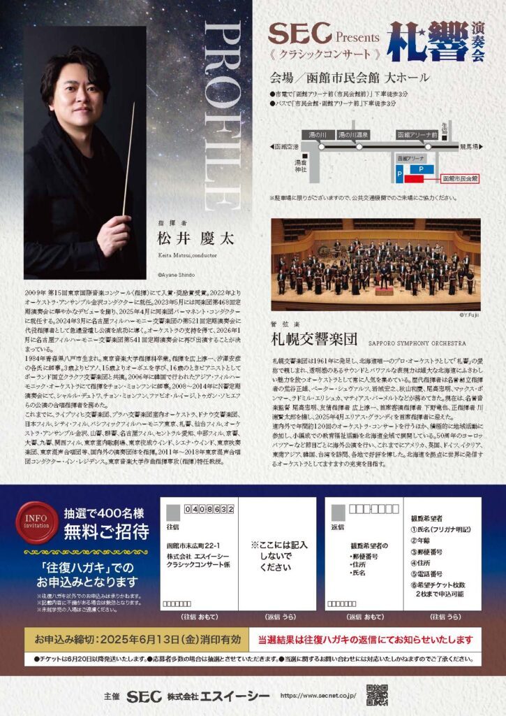 | お問い合せ先 | エスイーシー クラシックコンサート係 TEL:0138-22-7188 |