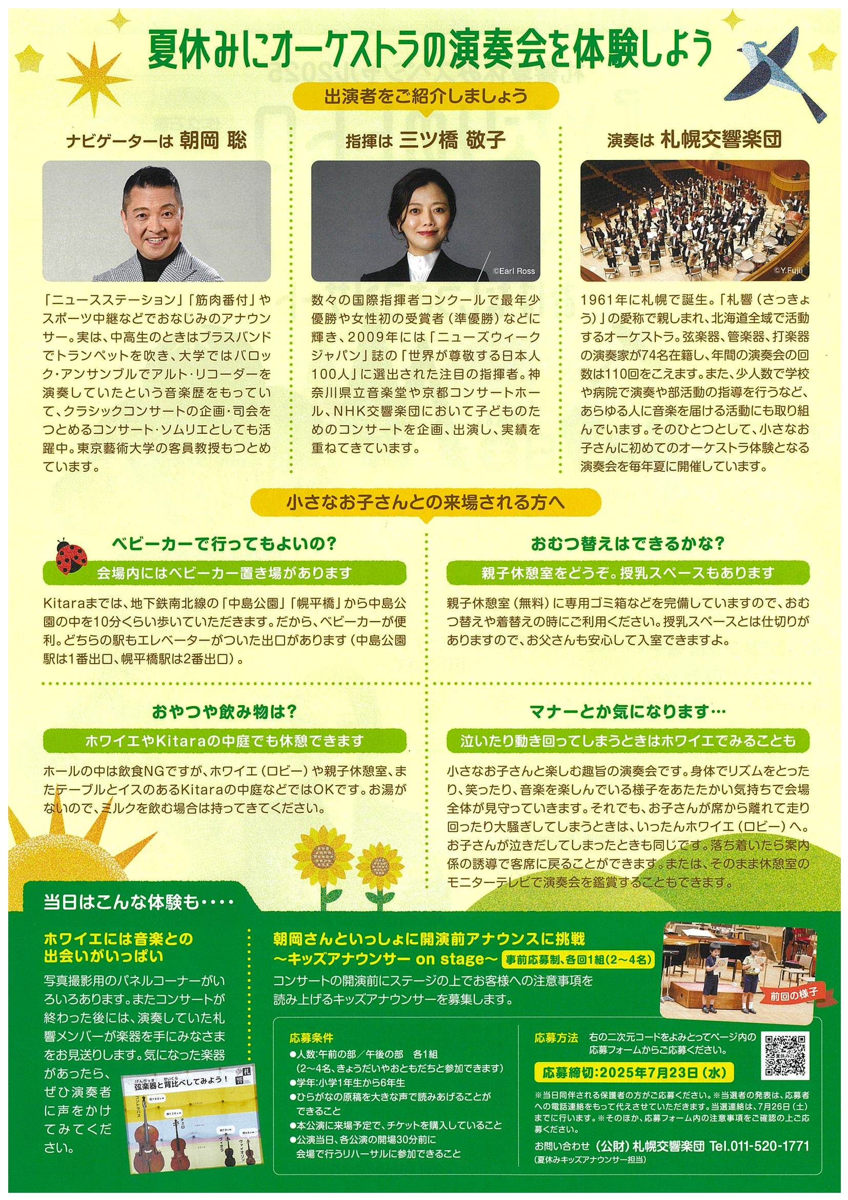 おとなも、こどども大好きなあの物語をオーケストラの奏でる音楽とやさしい語りでお届けします。楽器についても教えてくれる、日本版の「オーケストラ入門を」Kitaraで。 【泣いたり動き回ってしまうときはホワイエで見ることも】 小さなお子さんと楽しむ趣旨の演奏会です。身体でリズムをとったり、笑ったり、音楽を楽しんでいる様子をあたたかい気持ちで会場全体が見守っていきます。それでも、お子さんが席から離れて走り回ったり大騒ぎしてしまうときは、いったんホワイエ(ロビー)へ。お子さんが泣き出してしまったときも同じです。落ち着いたら案内係の誘導で客席に戻ることができます。または、そのまま休憩室のモニターテレビで演奏会を鑑賞することもできます。 【親子休憩室、授乳スペースもあります】 親子休憩室(無料)に専用ゴミ箱などを完備していますので、おむつ替えなどにご利用ください。 【ホワイエやKitara中庭でも休憩出来ます】 ホール客席内は飲食NGですが、ホワイエ(ロビー)や親子休憩室、またテーブルとイスのあるKitara中庭などではOKです。お湯がないので、ミルクを飲む場合は持参ください。 【キッズアナウンサー募集】 開演前にステージ上で、お客様への注意事項を読み上げてくれるキッズアナウンサーを募集します!お友達やごきょうだいと一緒にアナウンスにチャレンジして、夏の思い出を作りませんか?! ■応募条件■ ・募集人数:午前の部・午後の部 各1組 (2~4名、きょうだいやおともだちと参加できます) ・対象学年:小学1年生~6年生 ・ひらがなの原稿を元気よく読めること ・本公演に来場予定で、チケットを購入していること ・公演当日、各公演の開場前に会場で行うリハーサルに参加できること ■応募方法■ <応募フォームはこちらから> ※応募締め切り:7月23日(水) ※当日同伴される保護者の方がご応募ください。 ※当選者の発表は、応募者(保護者の方)への電話連絡をもって代えさせていただきます。当選連絡は7/26までに行います。 ※応募フォーム内の注意事項を必ずご確認ください。