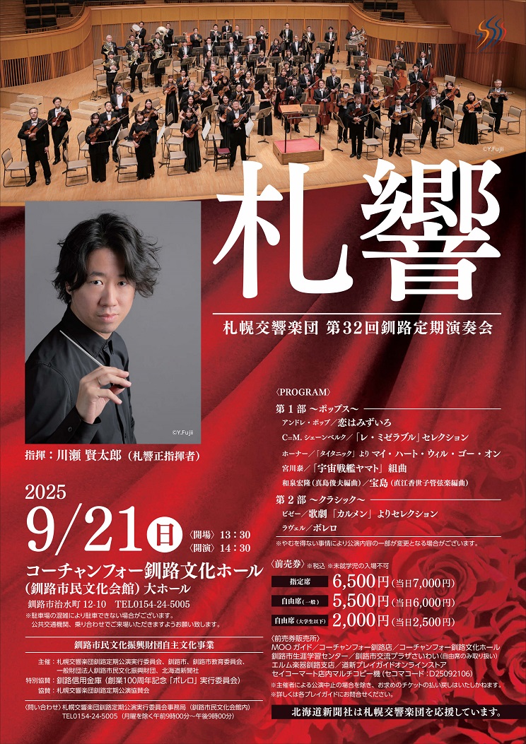 札幌交響楽団釧路定期公演実行委員会 釧路市、釧路市教育委員会、(一財)釧路市民文化振興財団、北海道新聞社 |