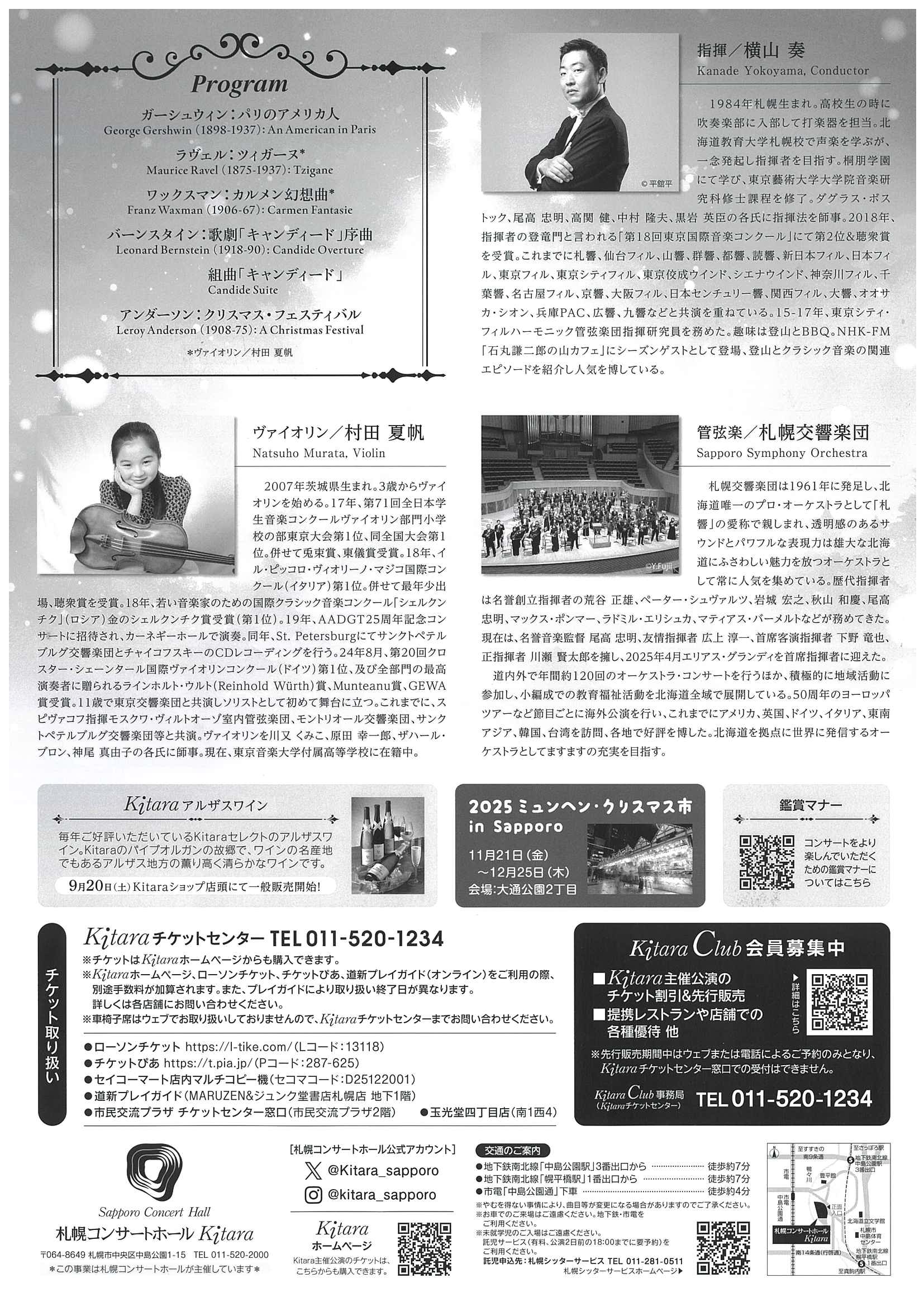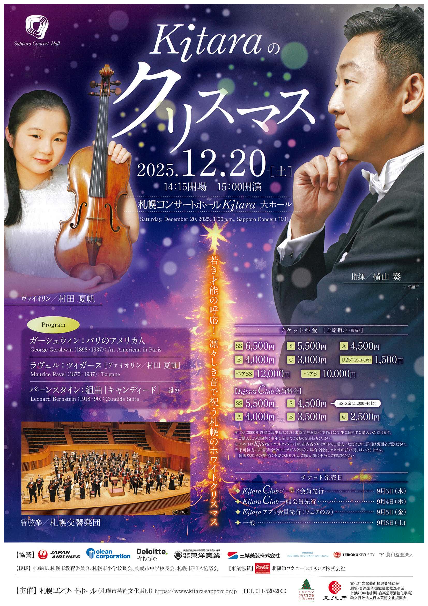 U25(ABC席)各席1500円、ペアSS席12,000円、ペアS席10,000円 ※U25:2000年以降にお生まれの方(未就学児を除く)であれば学生に限らずご購入いただけます。ご購入、ご来場時に生年を証明できるものをお持ちください。 ※未就学児入場不可 ≪チケット発売所≫:Kitaraチケットセンター、道新プレイガイド、玉光堂四丁目店、チケットぴあ、ローソンチケット、市民交流プラザチケットセンター ※札響会員はKitaraチケットセンター(窓口・電話予約・オンライン)でS席500円引 ※不可抗力により演奏会を中止せざるを得ない場合をのぞき、チケットの払い戻しはいたしません。体調や状況の変化に不安の方は、ご購入前に十分にご確認ください。 |