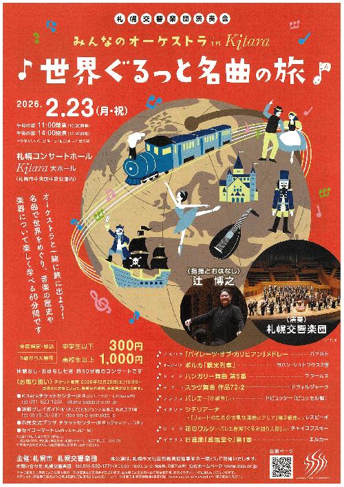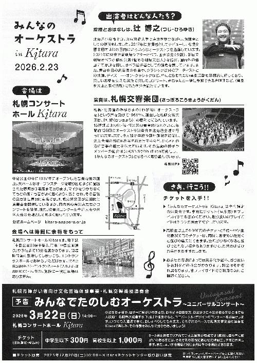| Ticket | 〇High School students and above 1,000 yen 〇5 years old to Junior High School students 300 yen (all reserved seating) ※Handling charge and/or postal charge may be added. ※Please bring an official document that certify the age (5 years old to junior high school) when purchasing the ticket. ※Children of 4 years old or younger cannot attend this concert. Babysit service available (paid service, needs reservation) Inquire Sapporo Sitter Service 011-281-0511 ※Ticket Office:Kitara Ticket Center, Doshin Playguide, Citizen Community Plaza Ticket Center, Seicomart (secomacode D26022301) ※When purchasing ticket, please confirm Terms and Condition on Ticket Purchase (https://www.sso.or.jp/viewpolicy/en.phpwww.sso.or.jp/viewpolicy/) ※Content of the concert may change due to unavoidable circumstances, but tickets are not refundable unless the concert is cancelled. |