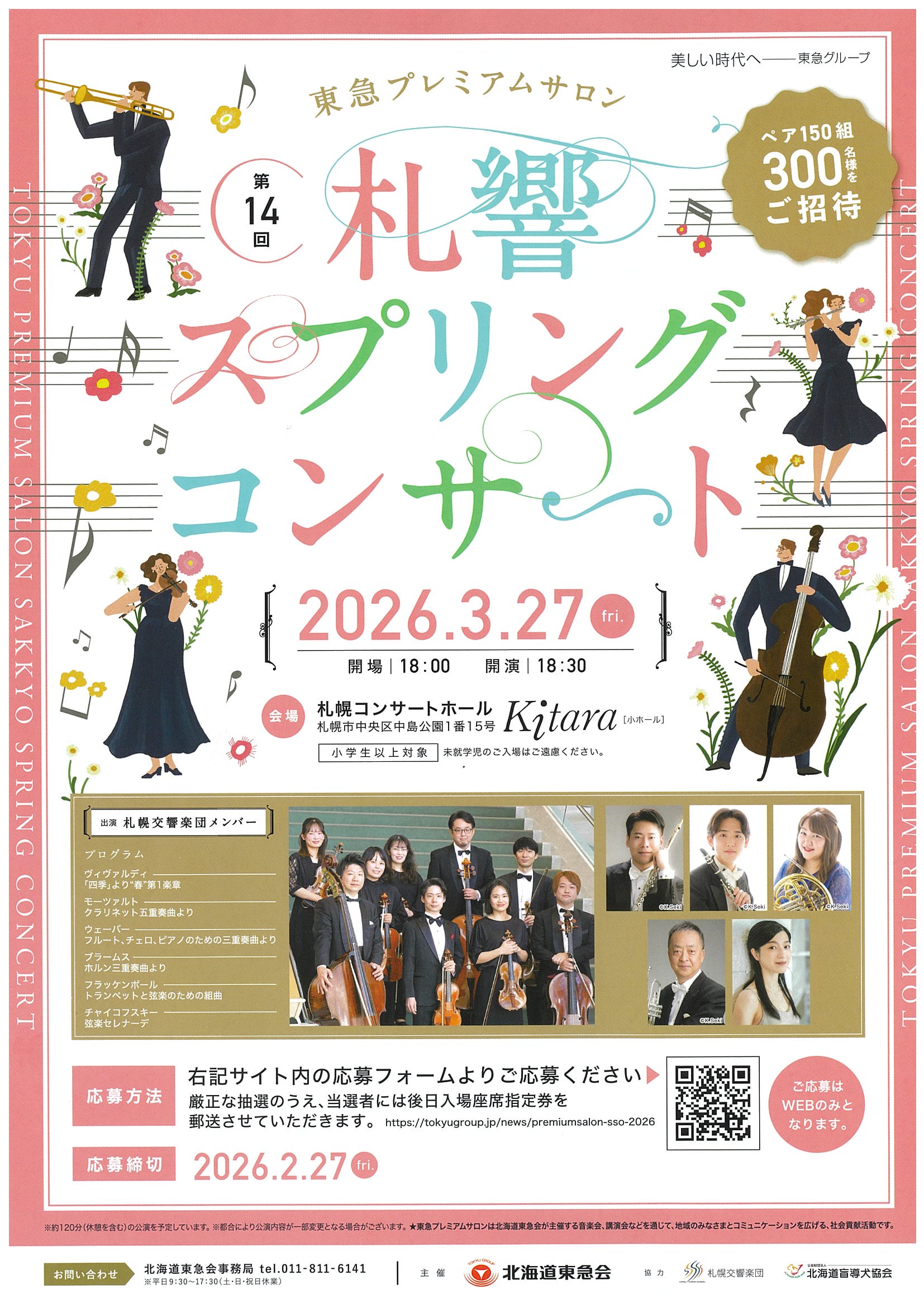 東急プレミアムサロンは北海道東急会が主催する音楽会などを通じて、地域のみなさまとコミュニケーションを広げる、社会貢献活動です。 この「札響スプリングコンサート」では、札響メンバーによるアンサンブルの演奏で、木管、金管、弦楽、それぞれの響きの違いをお楽しみください。