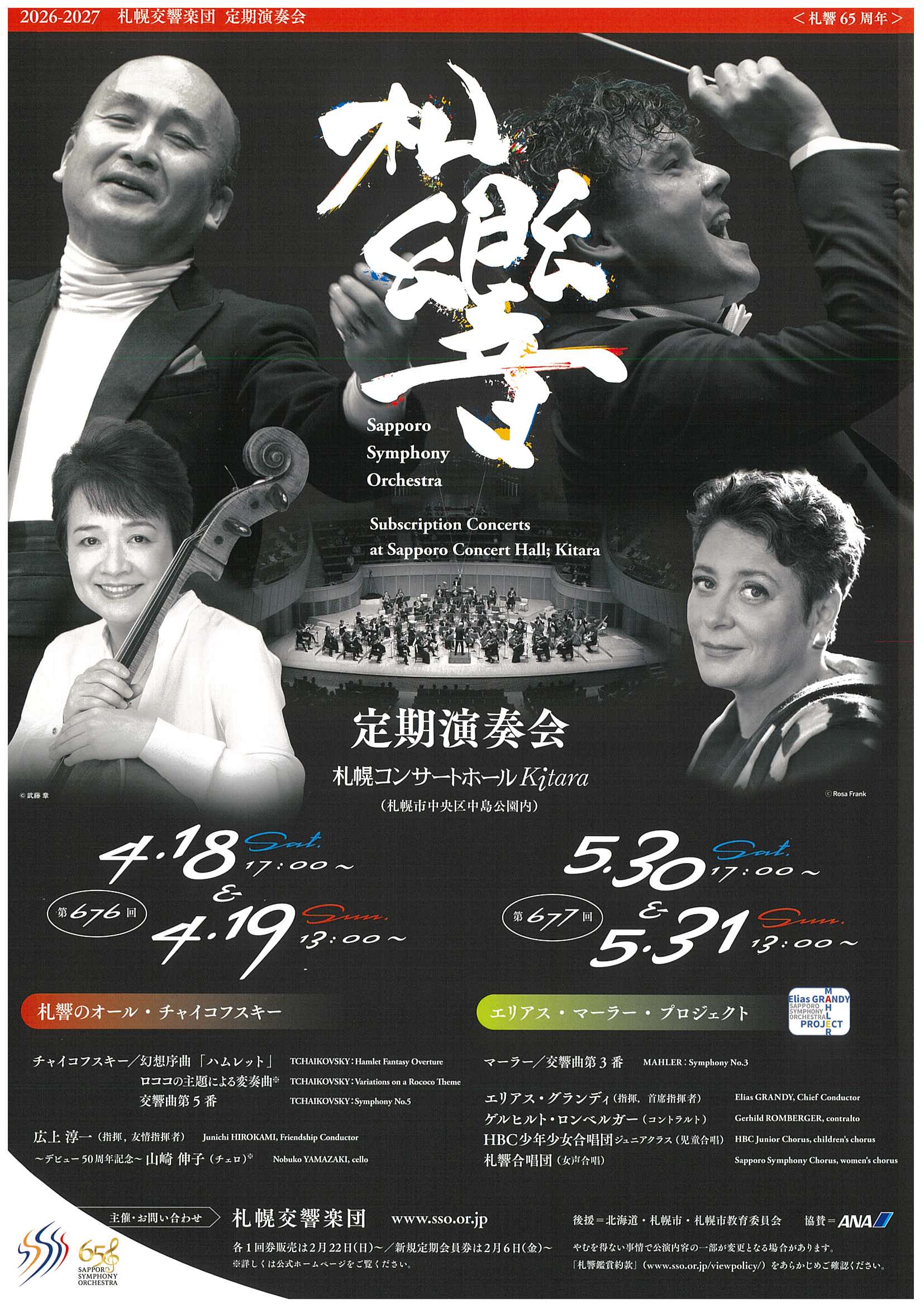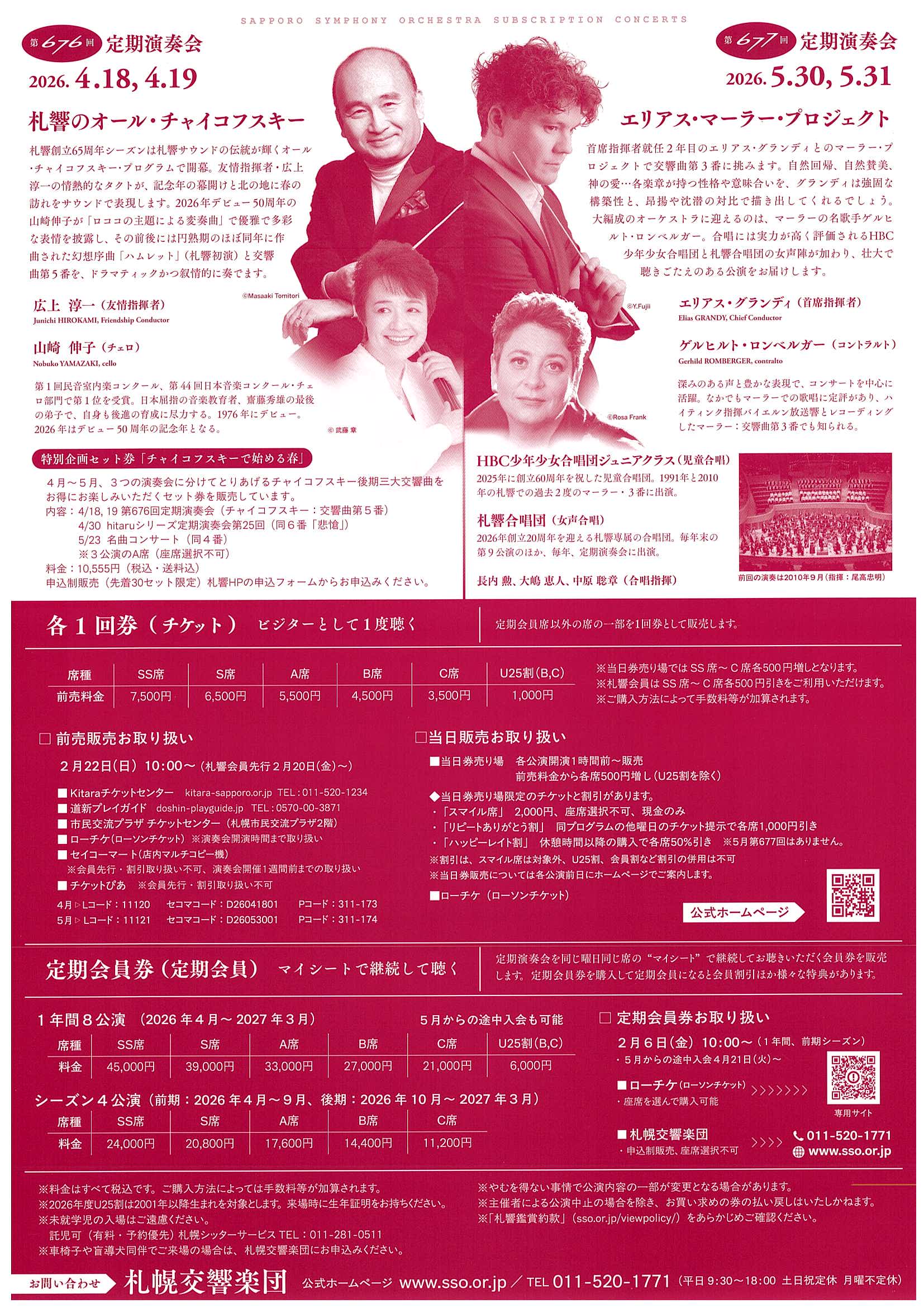 U25割(B,C)1,000円 【当日SS~C席各500円増し(U25割除く)】 ※2026年度U25割は2001年以降生まれ対象 ※スマイル席2,000円(Pブロック内スマイルエリア/当日限定販売) ※未就学児入場不可 ※札響会員は各席500円引きで購入できます(スマイル席、U25割、他割引の併用不可) ※プレイガイド:Kitaraチケットセンター、道新プレイガイド、市民交流プラザチケットセンター、ローチケ(ローソンチケット)、チケットぴあ、セイコーマート(店内マルチコピー機/セコマコード:D26041801(販売期間 2/22~4/11まで) ※ローチケでの座席選択は発売日の翌日深夜00:00より可能となります。 ●託児申込み(有料、予約制)札幌シッターサービス011-281-0511 ≪公演時における託児サービスについて≫ ※チケット購入に当たっては、鑑賞約款(www.sso.or.jp/viewpolicy/)をあらかじめご確認ください。 ≪開場は開演の40分前からとなります≫ ※開演時間を過ぎての入場や途中退場の場合、ご購入の席へのご案内ができないことがございます。予めご了承ください。 ※やむを得ない事情により公演内容の一部が変更になる場合がございます。公演中止の場合を除き、お求めのチケットの払戻しはいたしかねます。 |