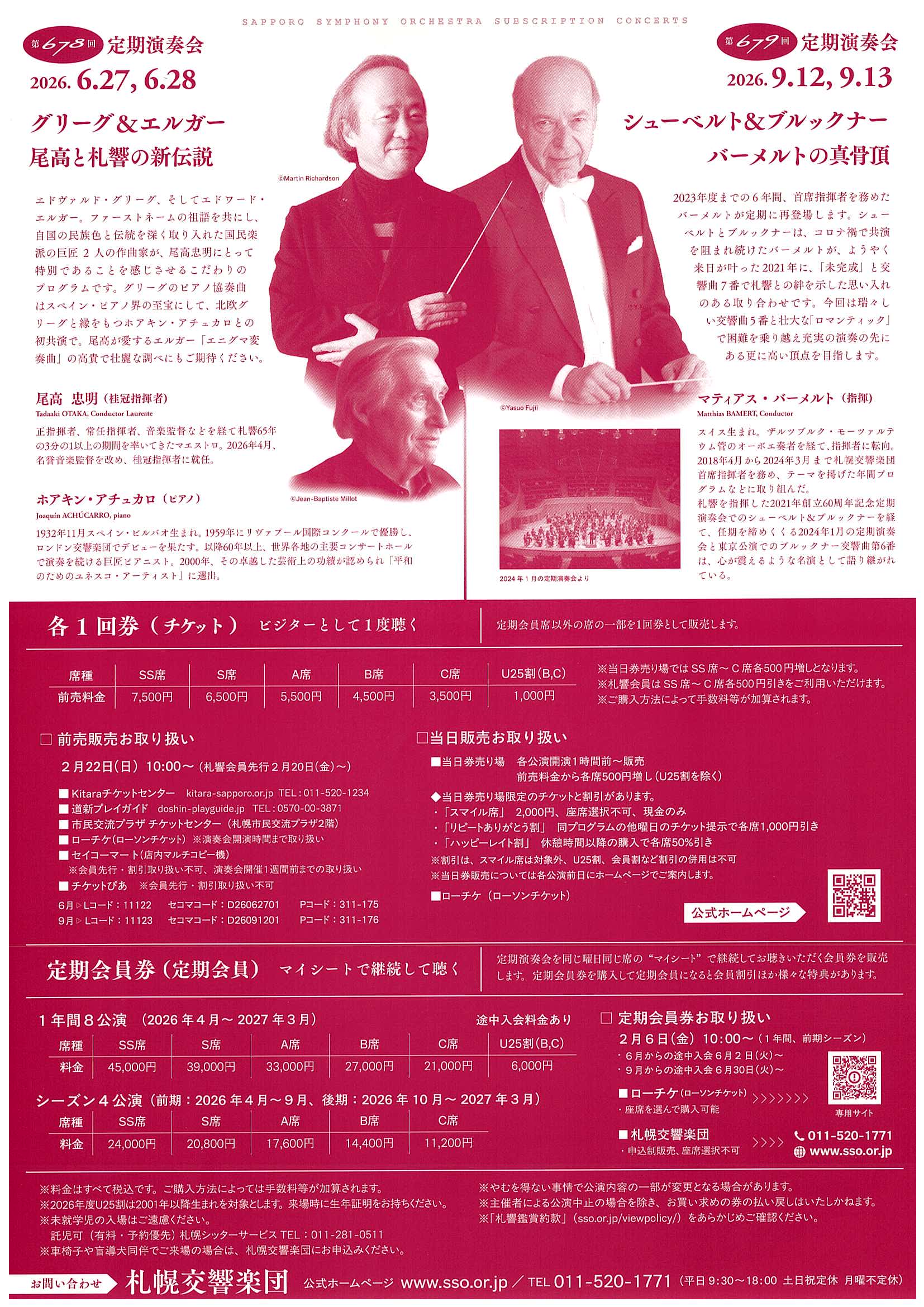 U25割(B,C)1,000円 【当日SS~C席各500円増し(U25割除く)】 ※2026年度U25割は2001年以降生まれ対象 ※スマイル席2,000円(Pブロック内スマイルエリア/当日限定販売) ※未就学児入場不可 ※札響会員は各席500円引きで購入できます(スマイル席、U25割、他割引の併用不可) ※プレイガイド:Kitaraチケットセンター、道新プレイガイド、市民交流プラザチケットセンター、ローチケ(ローソンチケット)、チケットぴあ、セイコーマート(店内マルチコピー機/セコマコード:D26062701(販売期間 2/22~6/20まで) ※ローチケでの座席選択は発売日の翌日深夜00:00より可能となります。 ●託児申込み(有料、予約制)札幌シッターサービス011-281-0511 ≪公演時における託児サービスについて≫ ※チケット購入に当たっては、鑑賞約款(www.sso.or.jp/viewpolicy/)をあらかじめご確認ください。 ≪開場は開演の40分前からとなります≫ ※開演時間を過ぎての入場や途中退場の場合、ご購入の席へのご案内ができないことがございます。予めご了承ください。 ※やむを得ない事情により公演内容の一部が変更になる場合がございます。公演中止の場合を除き、お求めのチケットの払戻しはいたしかねます。 |