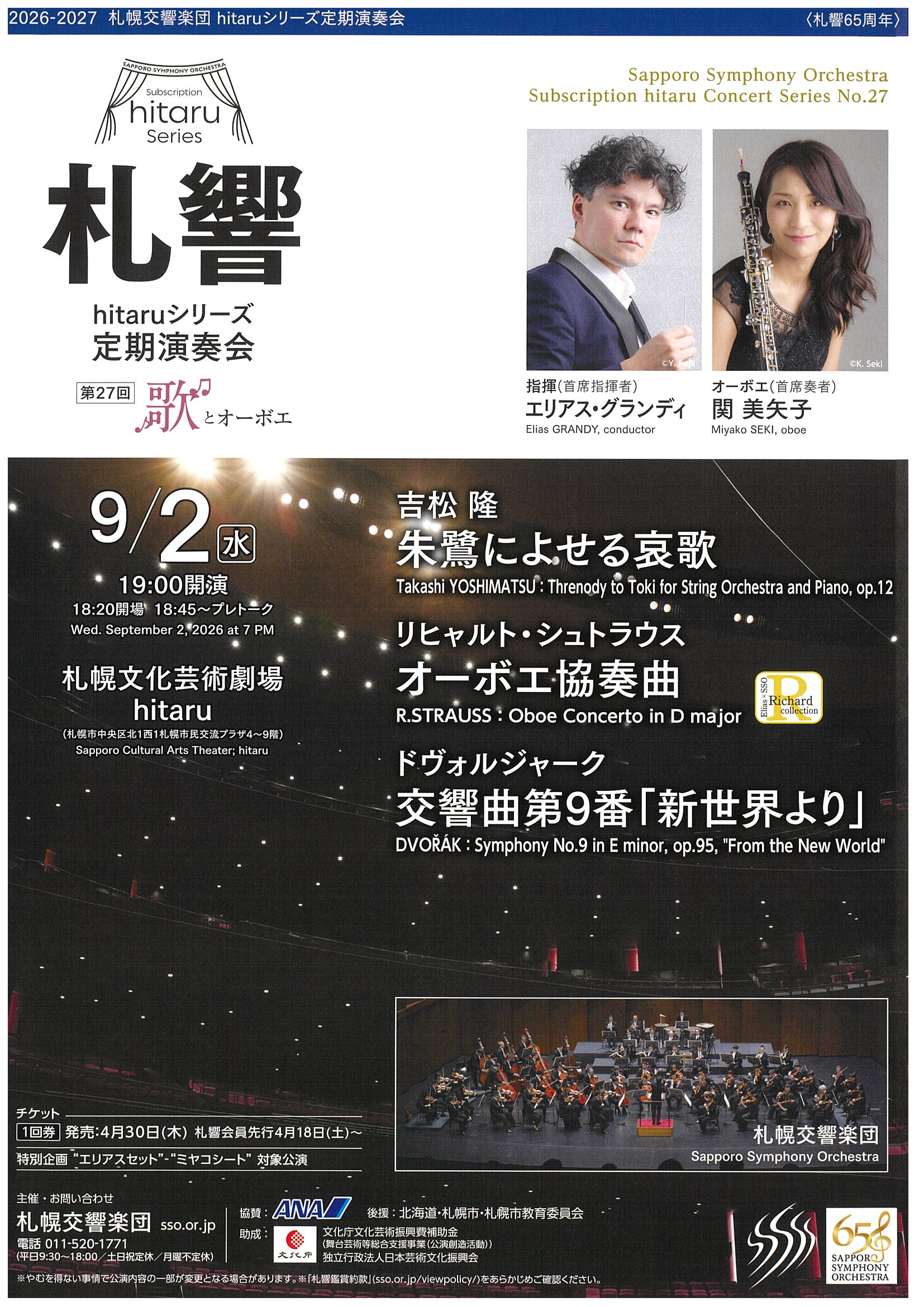 ■hitaruで平日夜開催の演奏会シリーズです。18:45~プレトークもお楽しみください。 ■札響メンバー応援「ミヤコシート」申込開始(申込開始2026年2月6日~) ■「エリアスセット」対象公演(申込開始2026年2月6日~) 『2026-2027 hitaruシリーズ4回通し券』2月14日(土)発売開始!!(会員先行1/30)