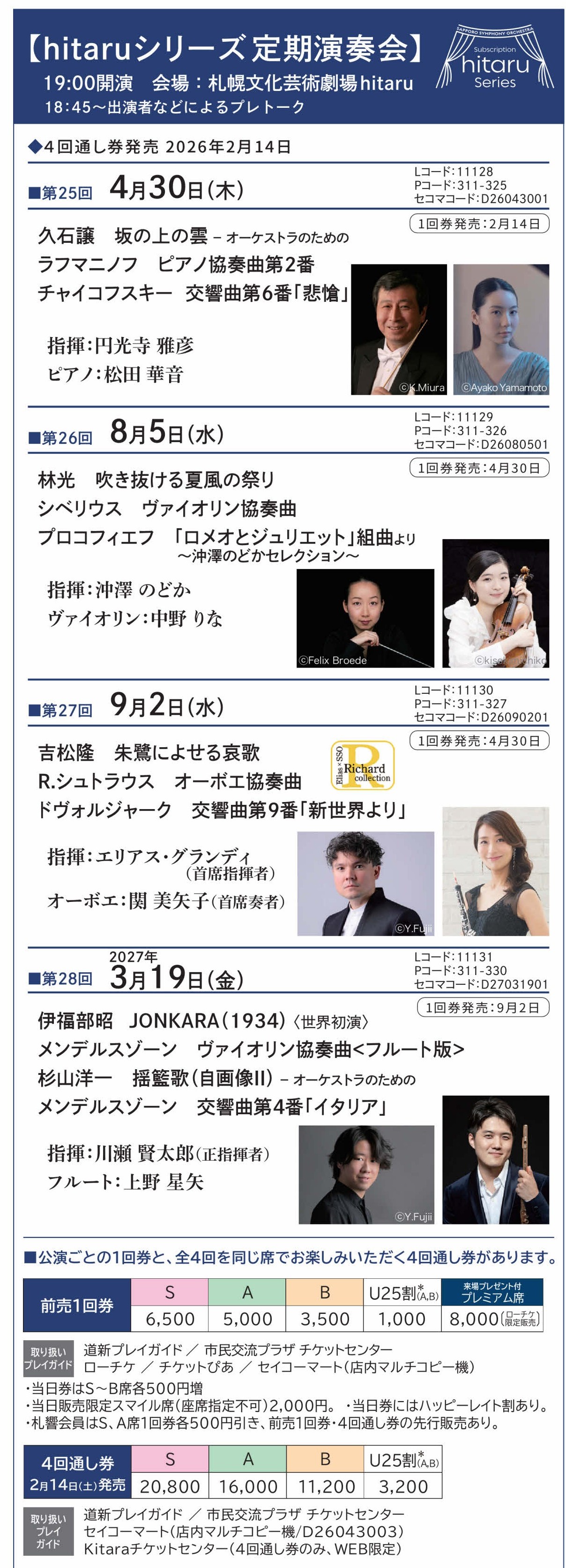 U25 (A,B) 1,000 yen 【On the concert day S~B each plus 500 yen(except for U25)】 ※U25 for the fiscal 2026 is for those who born on year 2001 or younger ※Premium Seat 8,000 yen(with a gift/from Lawson Tickets only) ※Smile Seats 2,000 yen(maybe with poor view/limited sale on the day of the concert) ※Lucky with Lawticket!? 2,000 yen(poor view or else?/sale from noon on the day of the concert) ※Preschoolers cannot attend this concert. ※Sakkyo members can purchase with 500 yen discount for S and A tickets. ※Ticket Offices:Kitara Ticket Center, Doshin Playguide, Citizen Community Plaza Ticket Center, Lawson Tickets, Ticket PIA, and Seicomart ※There will be no sale of single tickets at Kitara Ticket Center. ※Seats can be selected at Lawson Ticket only from one day after, from the midnight of the ticket sale starting date. ●Babysit service (paid service with reservation) Call Sapporo Sitter Service 011-281-0511 ≪Babysit service during the concert (Japanese only)≫ ≪Door opens 40 minutes before the start of each concert≫ ※Kindly aware that we may reject seating to the designated seat on your ticket for the late arrival. ※Program may change. There will be no refund of tickets unless cancelled by force majeures. |